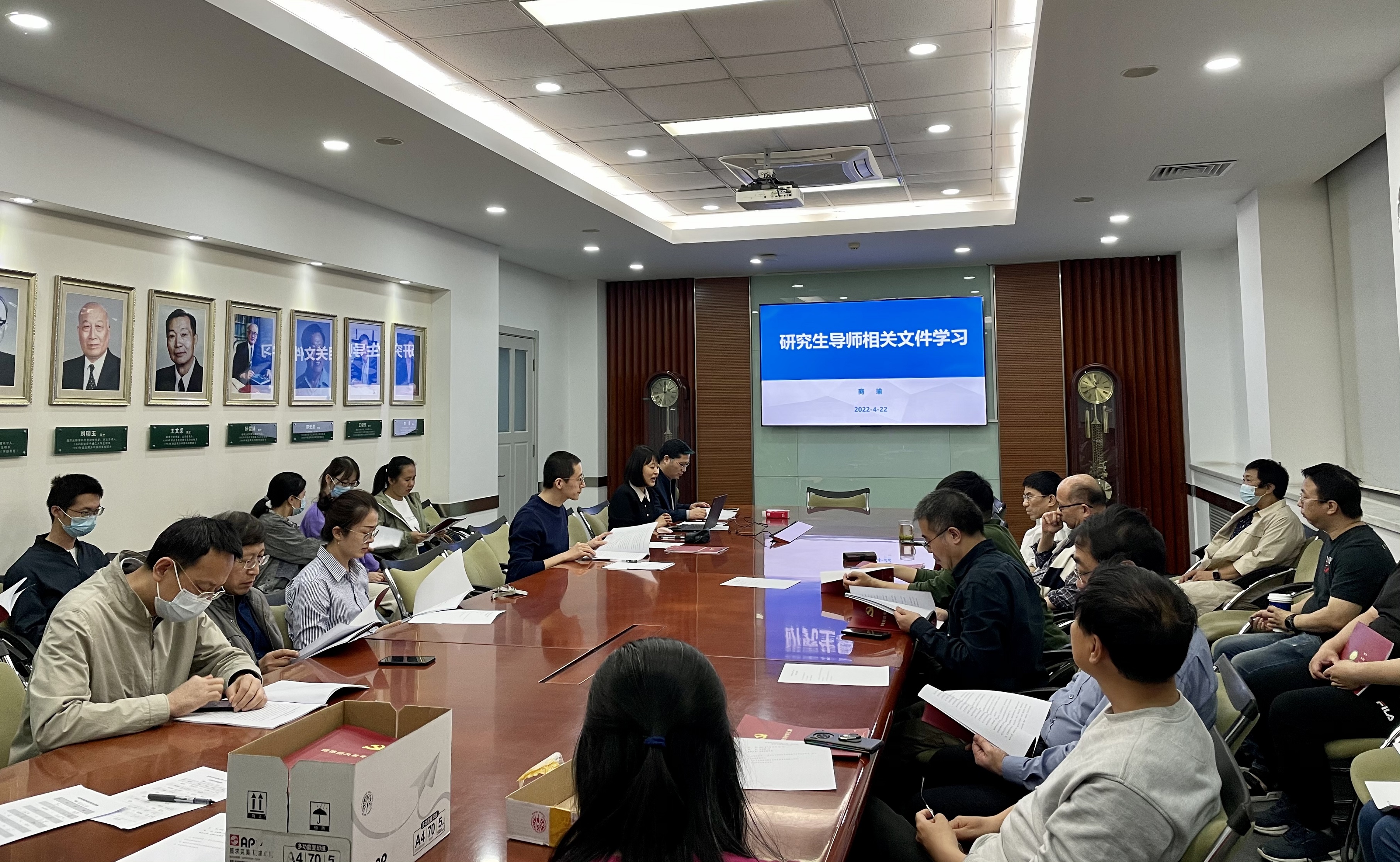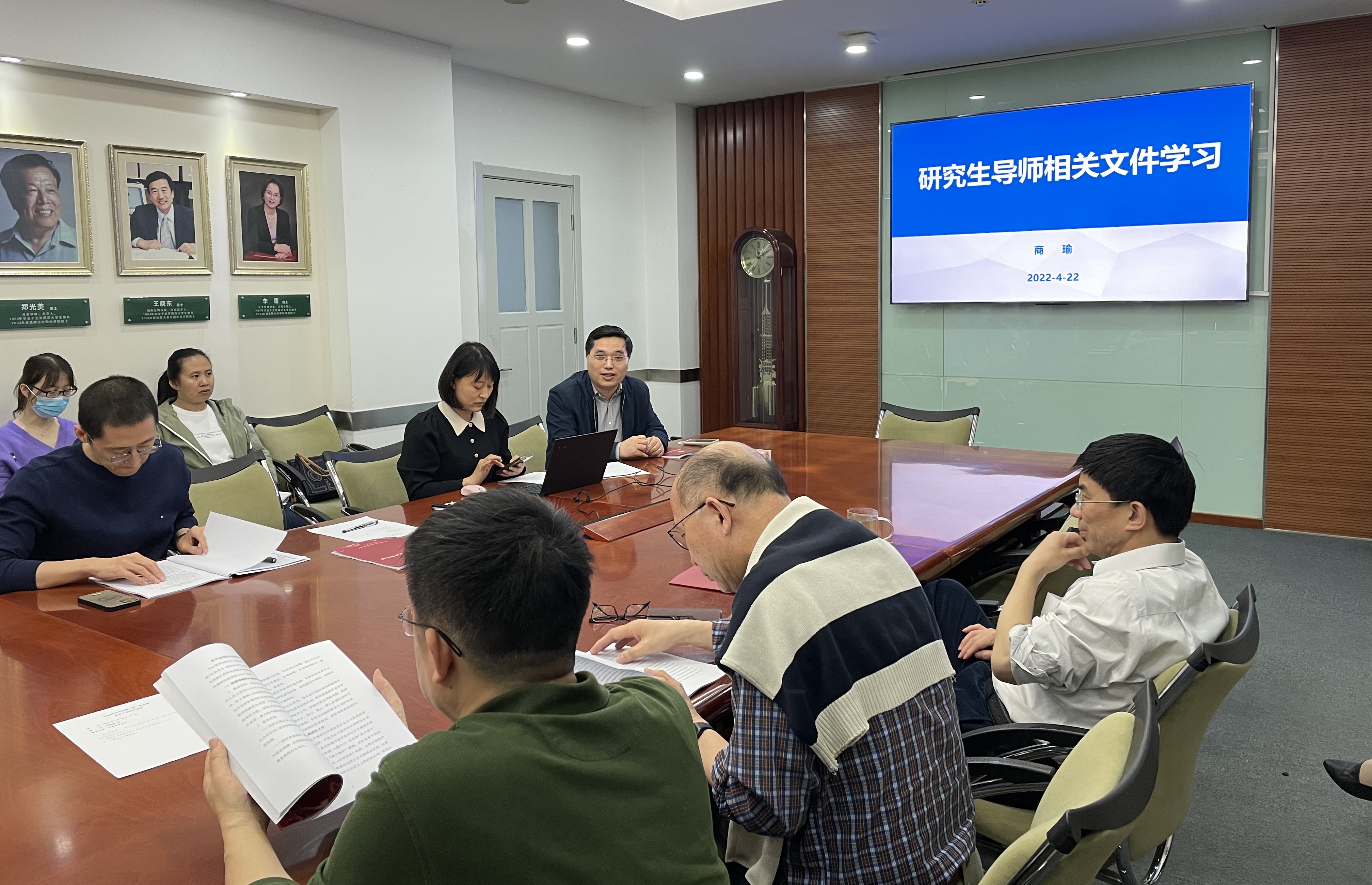 之后,商瑜老师带领全体教师学习了教育部印发的《教育部关于全面落实研究生导师立德树人职责的意见》、《研究生导师指导行为准则》、《教育部关于加强博士生导师岗位管理的若干意见》、《教育部关于高校教师师德失范行为处理的指导意见》中的重点内容。通过对文件重点内容的仔细梳理和若干师德失范行为案例的详细解析,让研究生导师夯实“导师是研究生培养第一责任人”的责任,明确政治站位和指导方向,强调师德师风重要性,了解师德失范处理的基本原则。
