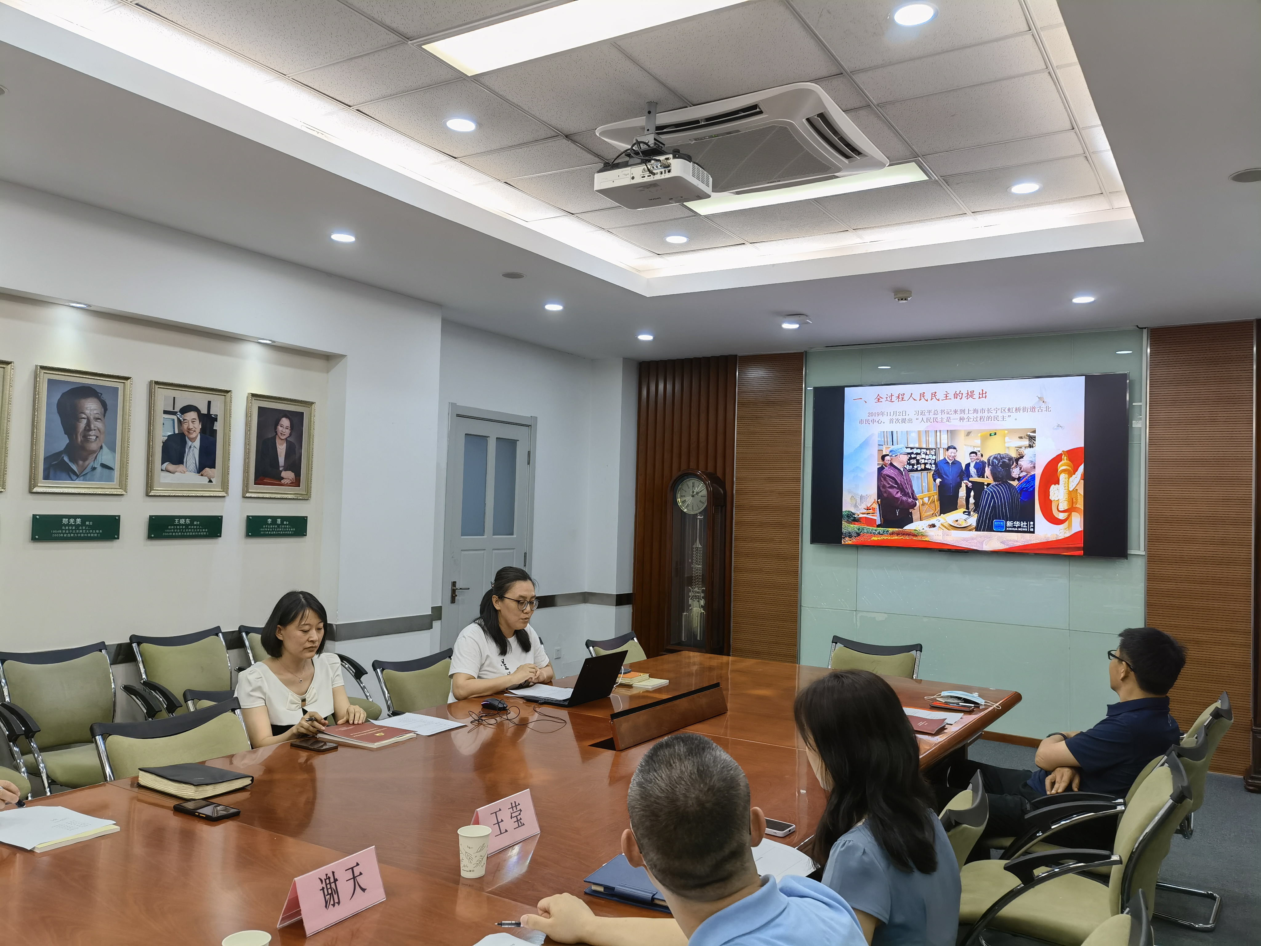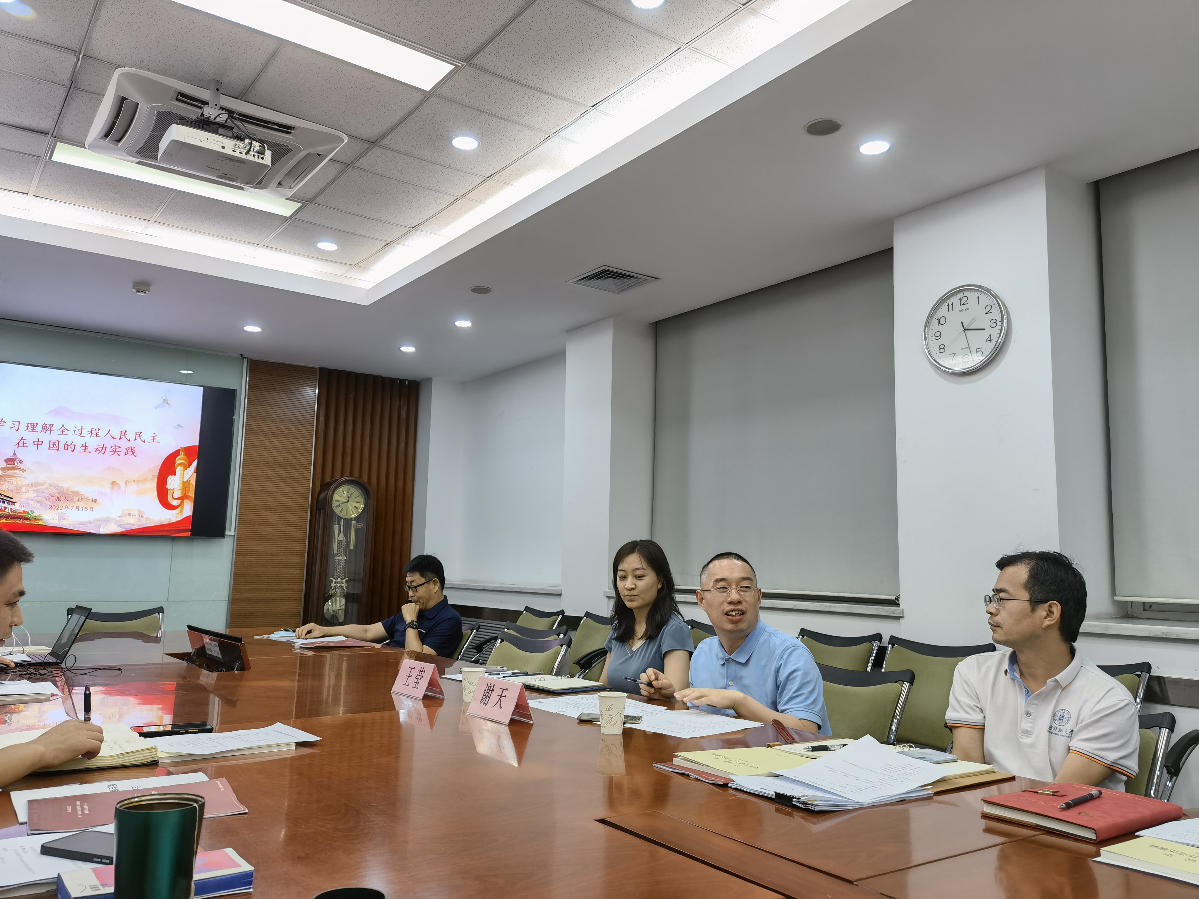 首先,孙一娜分享了全过程人民民主的提出以及全过程人民民主的内涵。接着,孙一娜通过三位人大代表的具体提案带领大家一起领悟全过程人民民主在我国的生动实践。最后,以社区居委会选举为例,介绍了基层民主实践的具体流程。交流发言环节,邓文洪、商瑜两位老师围绕个人经历阐述了对“全过程人民民主”的理解。谢天和王莹分别介绍了中心组巡听制度的发展,分享了学习收获,并对中心组今后的学习规划提出了宝贵建议。