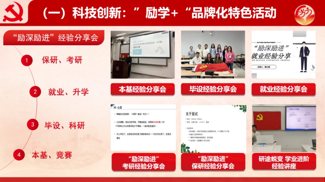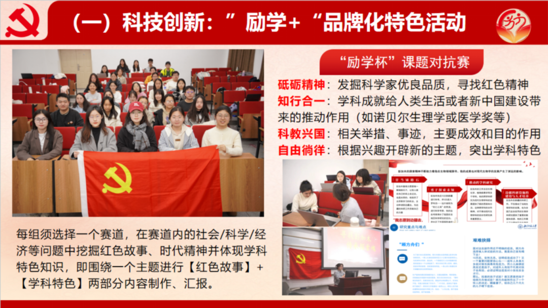 在科技创新方面,支部打造了三大“励学 +”品牌活动:“励学杯”课题对抗赛将党的理论知识与学科发展相结合,设置多个赛道,锻炼支部成员学术思考、创新表达和团队协作等多方面能力,已连续举办 4 届,反响热烈。“励深励进”经验分享会聚焦本科生学业科研需求,邀请优秀学长学姐分享经验,助力学生科研能力提升。“励学志”系列经验帖以实用信息分享为核心,以成长引领为目标,累计推出 7 期,阅读量800余次。