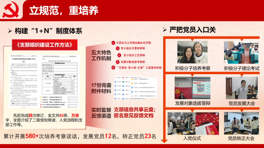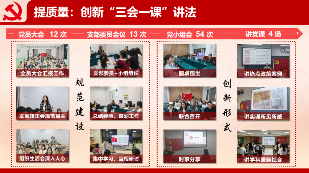在党员发展工作中,支部严格遵循从思想、理论到实践的多维度考察流程,确保党员队伍的纯洁性与先进性。此外,“三会一课”制度在严格落实的基础上不断创新形式,党课内容通过结合案例分析、实践经验分享以及学科知识解读等多种方式,使理论学习更加生动、务实。
