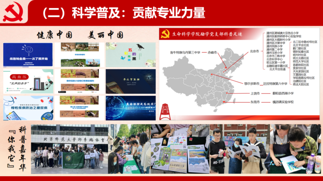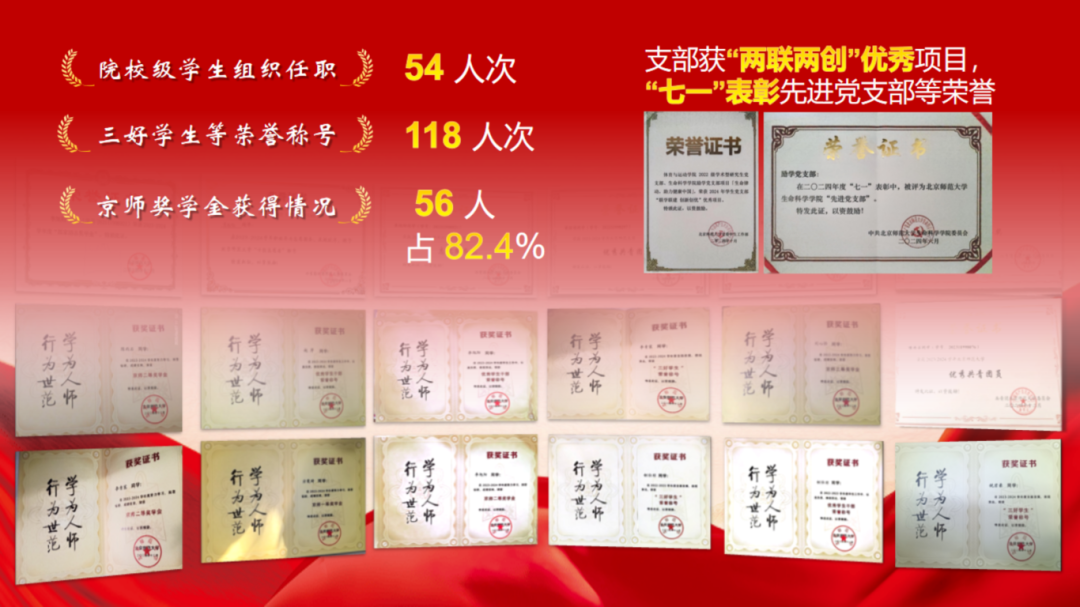 近年来,支部中涌现出 iGEM 国际竞赛金奖获得者、北京市三好学生、北京师范大学“十佳大学生”、北京师范大学“十佳志愿者”、北京师范大学“自强之星”、北京师范大学“阳光体育之星”等优秀个人。支部自身也屡获殊荣,连续两年参与“两联两创”项目,连续三年获生命科学学院“先进党支部”,2023 年获北京师范大学“先进党支部”,2024 年获“两联两创”优秀项目。