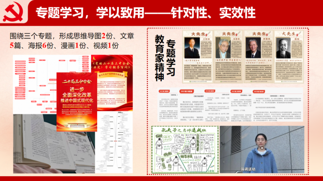 同时,支部注重理论学习成果的转化与展示,鼓励成员将学习心得转化为文章、海报、漫画、视频等多样化成果,使理论知识从抽象的文字转化为具体可见的作品,实现了从“学有所获”到“学有所思”的深度转化。