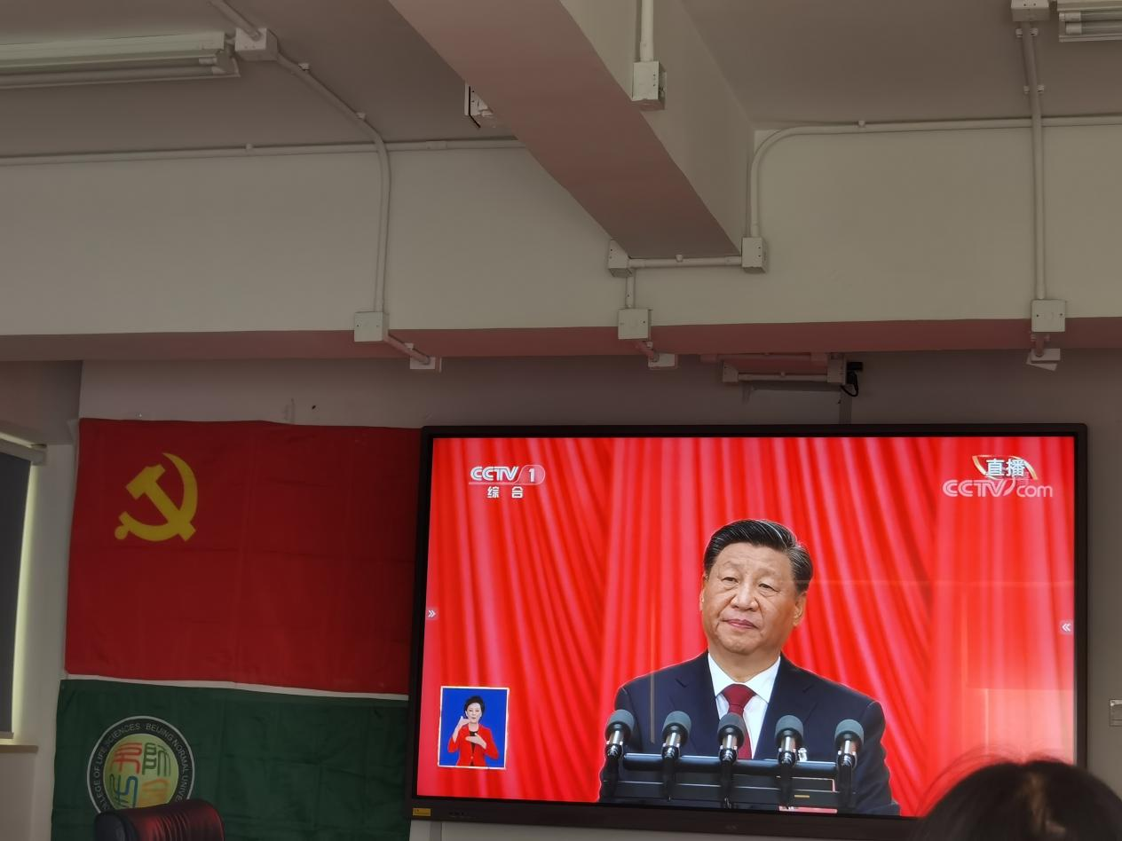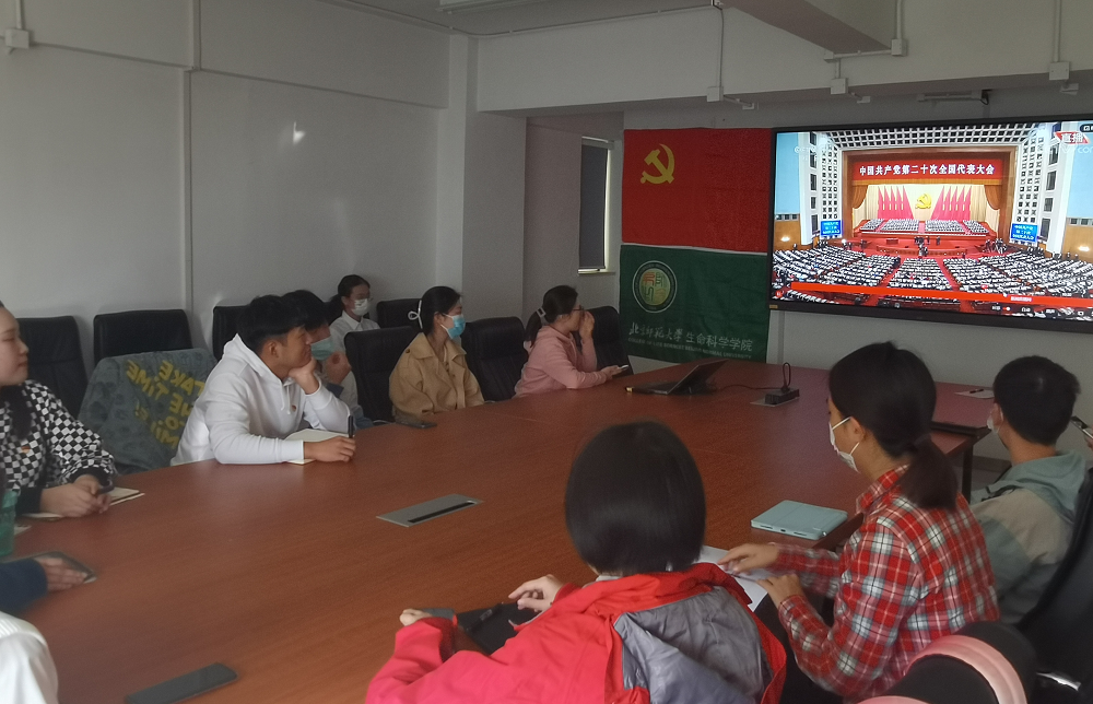 2022年10月16日10:00,中国共产党第二十次全国代表大会开幕会在北京人民大会堂隆重举行。中共中央总书记、国家主席、中央军委主席习近平同志出席大会并发表重要讲话。生命科学学院组织各学生党支部支委在生态楼419会议室观看直播,党委书记王天明老师、党委副书记殷实老师、团委书记尹佩佩老师莅临现场,共19人参与。