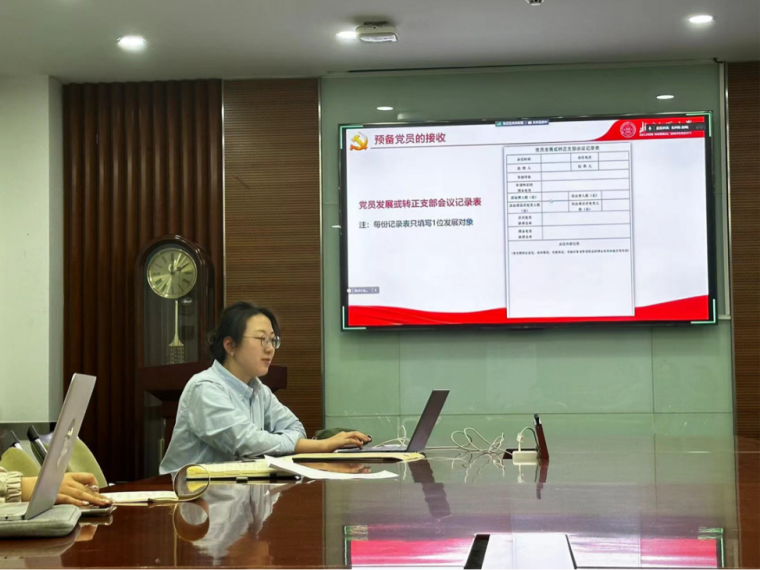 会议开始,殷实老师强调了基层党组织规范化建设的必要性,首先从“三湾改编”讲解引入支部建设的目的,并通过一系列政策文件的解读说明学校党委对基层党组织规范化建设的重视。随后,为了帮助各支书支委更好地把握党员发展的各个步骤,殷实老师对从提交入党申请书开始,到入党积极分子的确定和考察培养,再到发展对象的确定和考察,预备党员的接收以及预备党员的教育、考察和转正,细致入微的介绍了党员发展的具体流程、材料准备和注意事项。殷实老师强调入党的流程有着固定严谨的顺序和要求,因此每一个细节需要格外注意,力争做到零差错、零失误,希望大家可以认真对待组织工作。