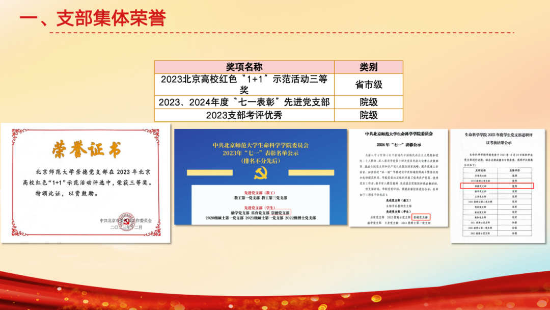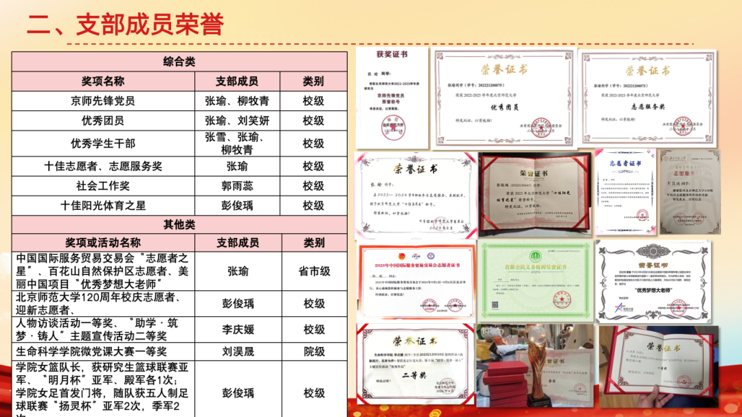 崇德虽成立不到两年,但收获诸多荣誉。获北京高校红色1+1示范活动三等奖,连续两年评为先进党支部,且在年末考评中获得“优秀”。6名同志获评“京师先锋党员”“优秀学生干部”等校级荣誉,涌现出“十佳志愿者”、“十佳阳光体育之星”等先进个人,成员在服贸会等志愿服务及微党课、体育竞赛等活动中均有突出表现。2023年支部14人获得学业一等奖学金,成员发表SCI论文两篇,中文核心论文两篇,在学术会议中汇报数次。