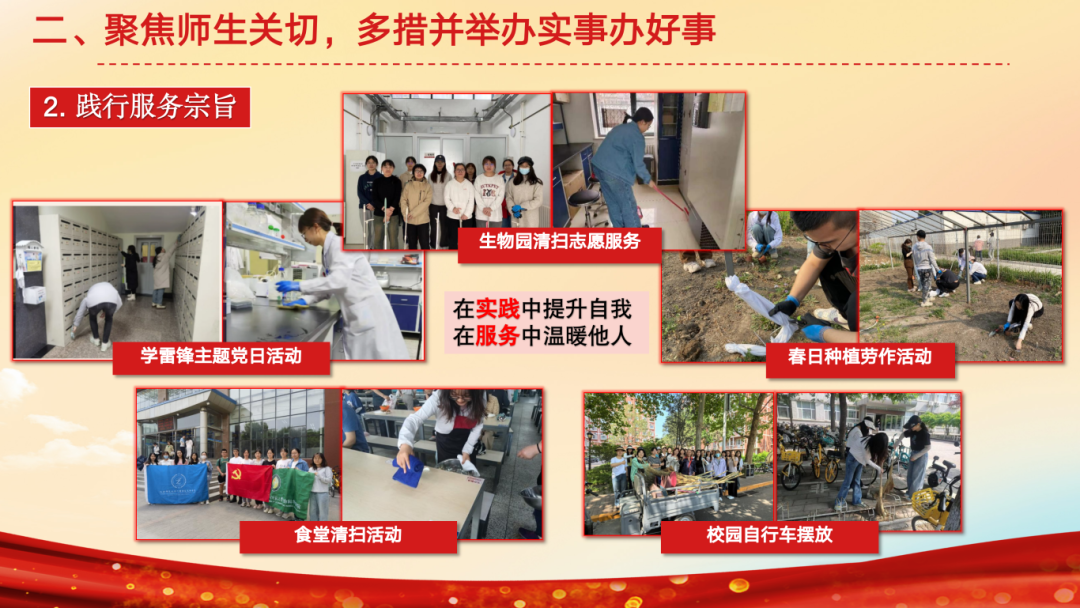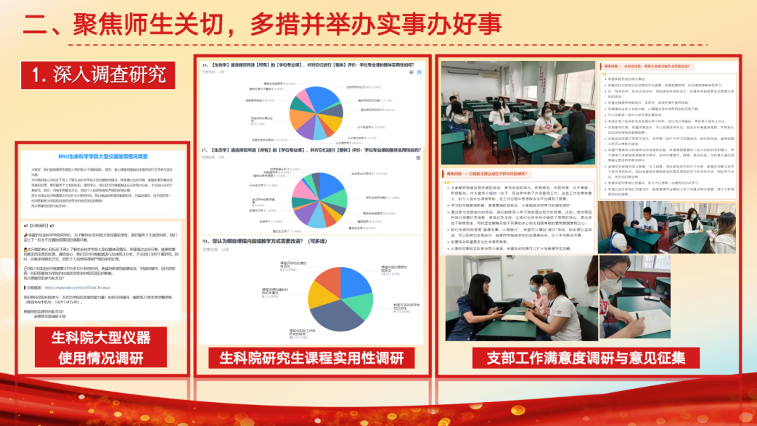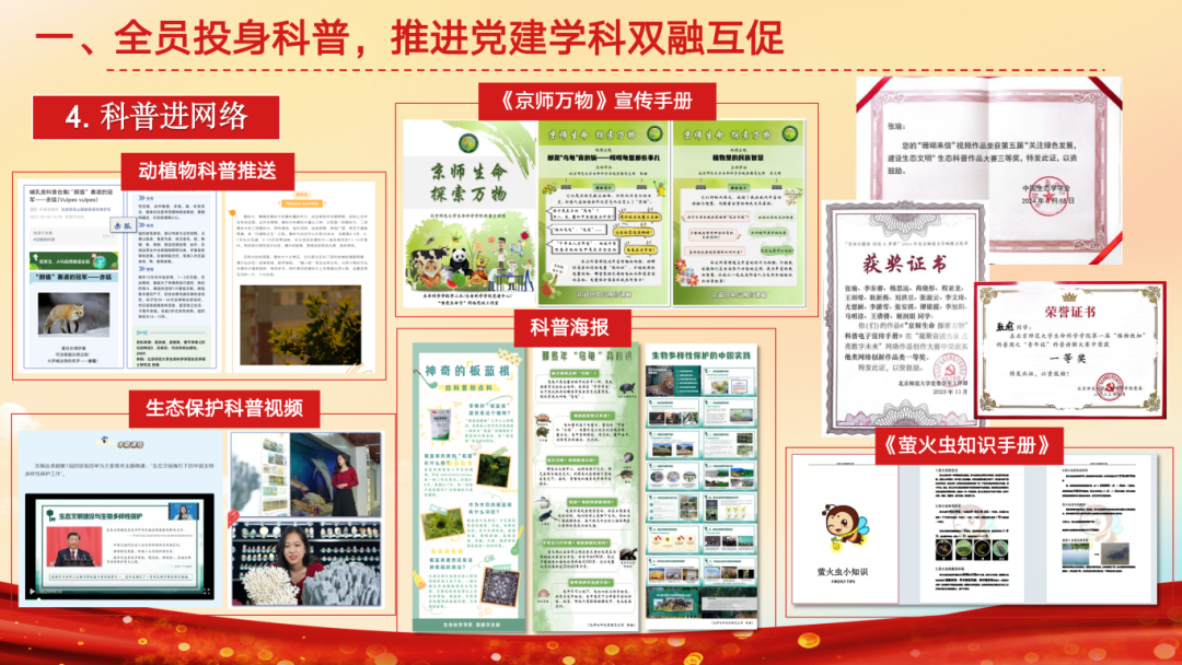 支部依托“崇德向善,以身践行”的核心理念,以青年行动促进全民科学素质提升,重点开展科普工作。支部超过84%的同志参与过科普工作,33名同志设计13门课程,深入市科学中心、通州区各小学,助力首都科普与城市副中心建设;面向广东、江西、内蒙古开设线上课程,成员被美丽中国授予“优秀梦想大老师”荣誉,支部与13个单位开展24场科普讲座,受众超过4000人次。本学期支部11名同志先后赴密云一小主讲6次生态理论课程,帮助学生提升自然观察力;并组织鸟类调查实践教学,15名支部同志担任助教。与金融街深度共建,围绕生态安全、人体健康开展4期科学素养训练营,成员赴安全基地讲解知识,带领小朋友外出参观;今年六一,支部为科普进社区活动设立鸟类及植物科普展区。2023年获北京高校红色1+1示范活动三等奖。同时,推出动植物科普推送,拍摄《珊瑚保护》科普视频,设计《神奇的板蓝根》等3幅海报及《京师万物》等2份科普手册,获校内网络作品创作大赛一等奖、中国生态学会生态科普作品三等奖。此外,聚焦师生关切。着眼研究生课程、实验仪器组织调研,面向支部征集意见,助力学院及支部发展。践行服务宗旨,组织打扫学院大厅、实验室等公共区域,并举办两期生物园种植劳作活动。