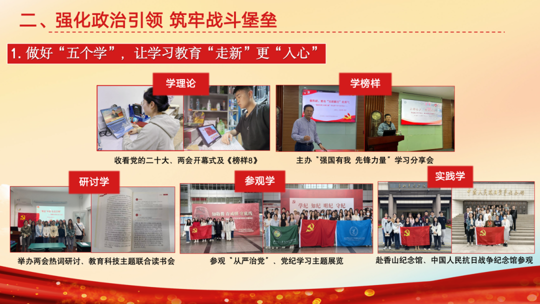 支部持续健全组织建设,2023年9月至今,发展党员4名,按期转正党员1名,吸纳9名新积极分子,出台《请假与考勤制度》、《发展对象选拔标准》等。落实三会一课,召开5次党员大会、8次支委会、15次党小组会及主题党课,赋能党员教育提质增效。同时强化政治引领。一是做好“五个学”,通过学理论、学榜样、研讨学、参观学、实践学,实现教育“走新”更“入心”。二是围绕党纪学习,成员研读《条例》、参观法院博物馆、聆听党纪主题党课、观看党纪电影,使得主题教育更系统、更有实效。三是依托标杆院系示范引领作用,立足“三个服务”,开展各层级共建。服务全校师生,联合外文博学党支部开展“我为师生办实事”等“两联两创”活动;服务乡村振兴,联合密云一小将生态教育带入郊区;服务社区儿童,将金融街志愿服务常态化。