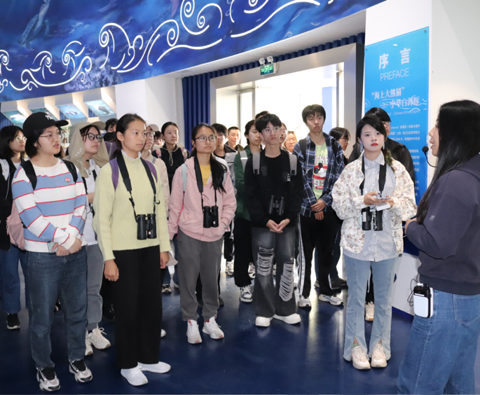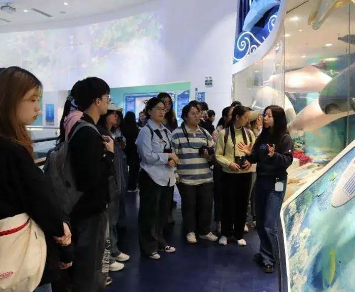 大家首先来到中华白海豚科普馆,负责人周瑞春老师结合生物标本和图文介绍,为学员们依次讲解了鲸豚家族演化史及其生命周期,接着进一步介绍粤港澳大湾区海洋生物多样性,并结合当地实例阐述如何开展海洋动物保护和救援工作。通过周老师的讲解,同学们进一步了解了海豚的生活习性,并明确了海豚在维持海洋生态系统功能中起到的重要作用。