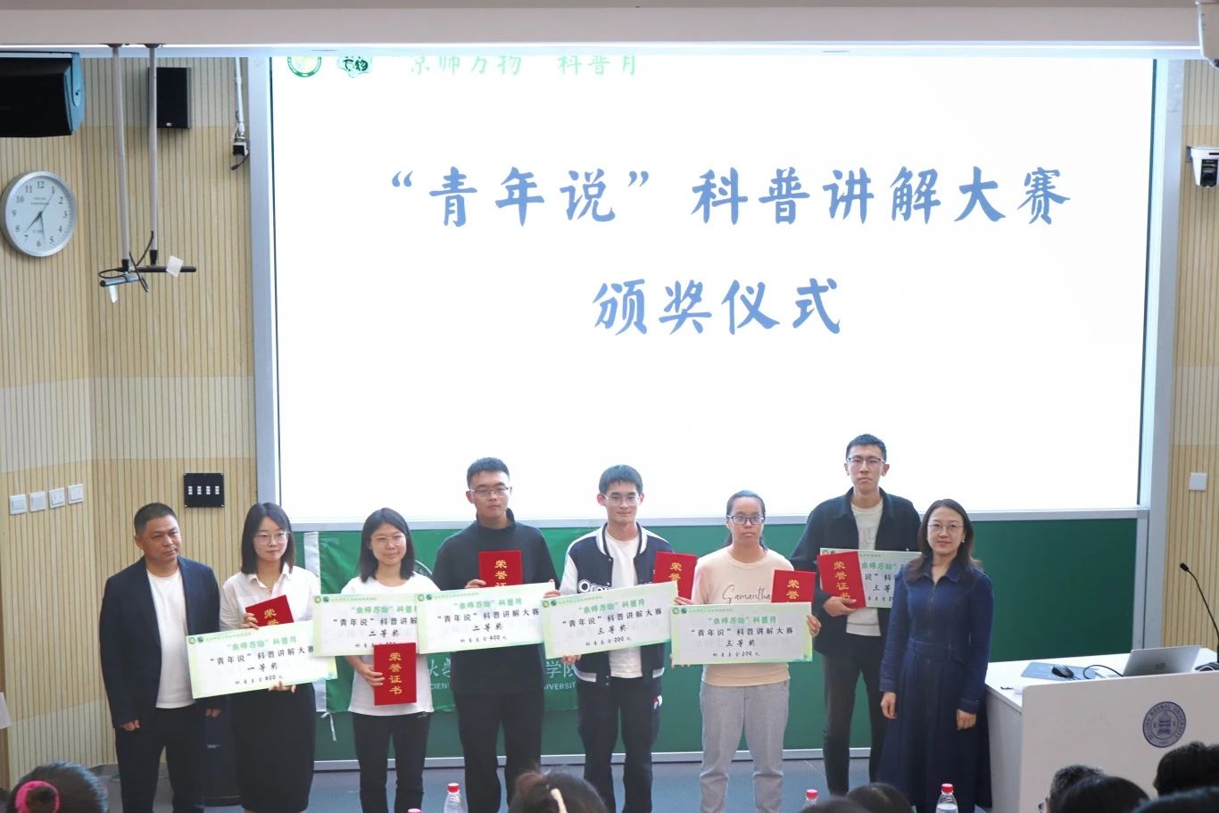 经过紧张激烈地角逐,“青年说”科普讲解大赛的获奖结果也终于出炉,生命科学学院党委书记王天明老师和党委副书记殷实老师为在“青年说”大赛中获得一、二、三等奖的选手颁发获奖证书及科普基金。