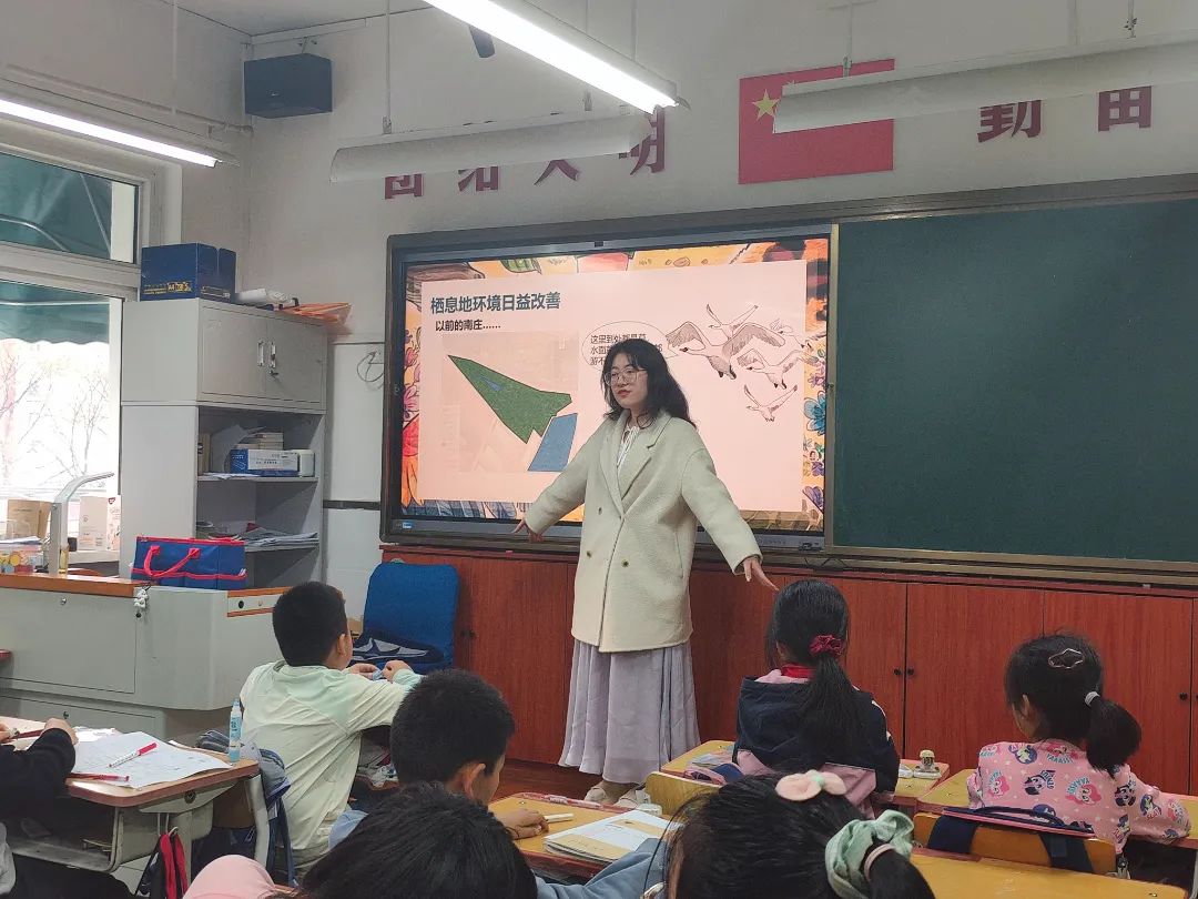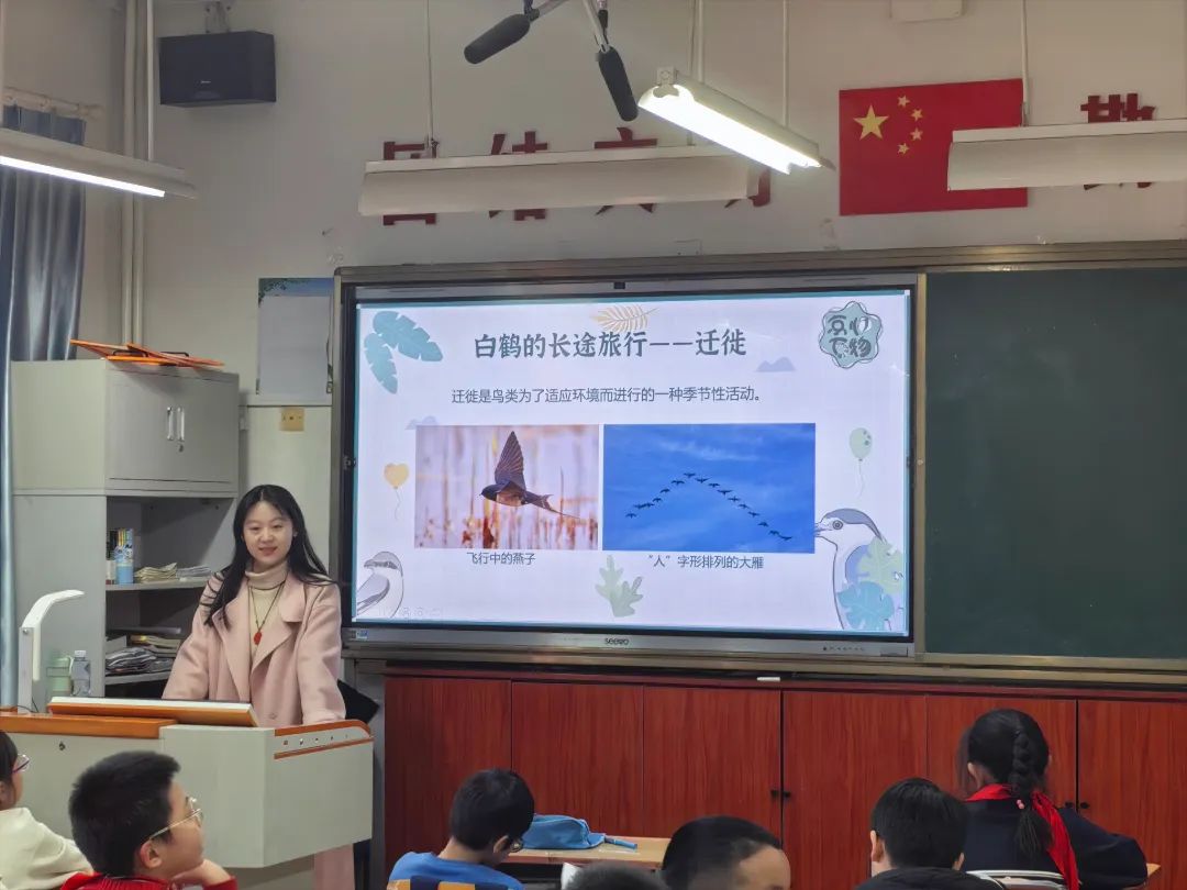 2025年3月6日,宣讲团志愿科普老师为同学们带来了第一讲《动物保护——白鹤的一生》。一个“我来描述你来猜”的小活动,让同学们根据给出的四个线索,猜出神秘生物的真实身份——白鹤,课堂氛围一下子活跃起来。之后志愿者们跟随白鹤的视角,生动地讲述了白鹤迁徙的一生,同时让同学们认识到包括白鹤在内的濒危动物所面临的各种胁迫和保护措施,更加明确了保护物种的必要性和急迫性。