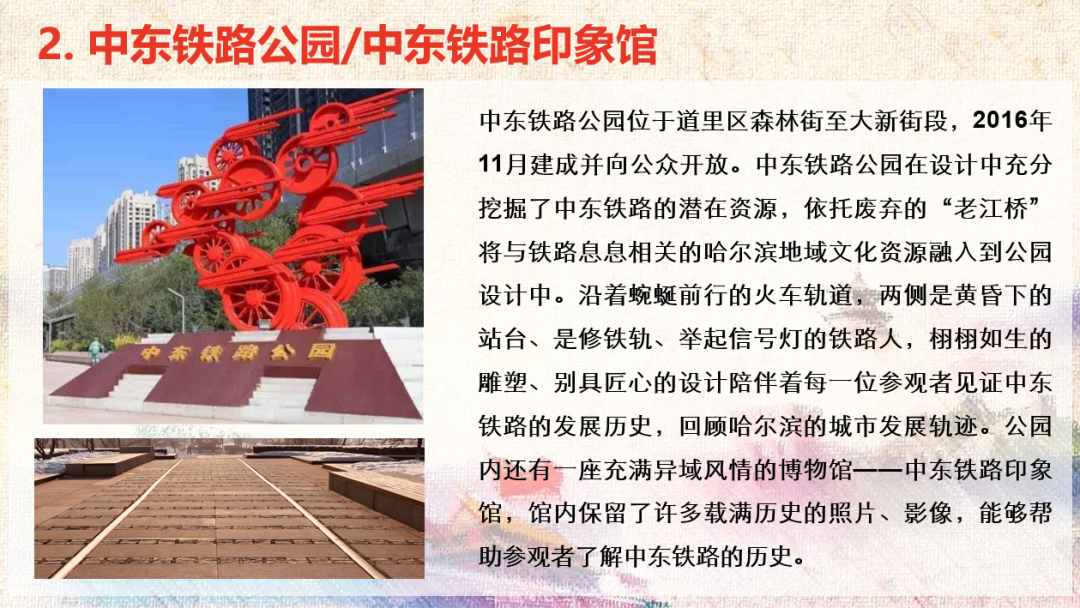 随后,张涵涵同志带领大家了解了中东铁路公园及中东铁路印象馆。中东铁路公园是由中东铁路的历史遗迹改建而成,园内保存了多处历史建筑,展示了这条铁路在中国近现代史上的重要地位。中东铁路印象馆则通过多媒体展览与历史文物,重现了中东铁路的修建历程及其对中国东北地区发展的深远影响。