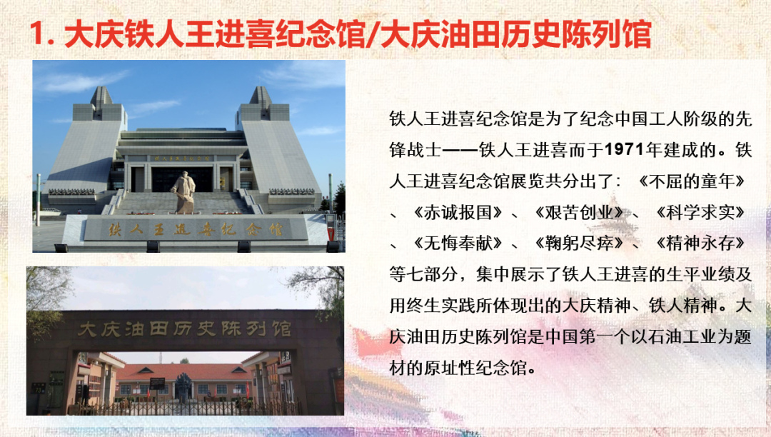 首先,张涵涵同志介绍了大庆铁人王进喜纪念馆及大庆油田历史陈列馆。大庆铁人王进喜纪念馆以“铁人”精神为核心,展示了王进喜同志在大庆油田的奋斗历程及其对新中国石油工业的贡献。大庆油田历史陈列馆则通过丰富的展品和详实的资料,展现了大庆油田从发现到发展的历程,生动再现了石油工人的无畏精神和不屈不挠的斗志。