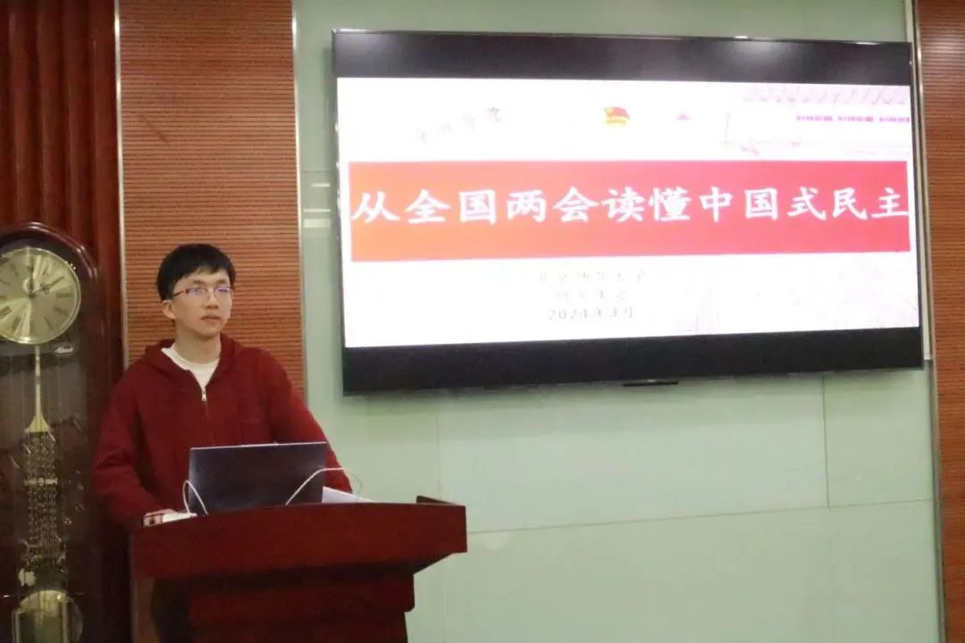 为进一步深入学习贯彻习近平总书记重要讲话和全国两会精神,以“敏锐之眼”与“关切之心”融身社会,关注民生民情与社会发展等焦点问题,生命科学学院立身党支部于2024年3月18日晚19:00邀请北京师范大学青春讲师团成员邹思捷开展主题为《从全国两会读懂中国式民主》集中学习活动。