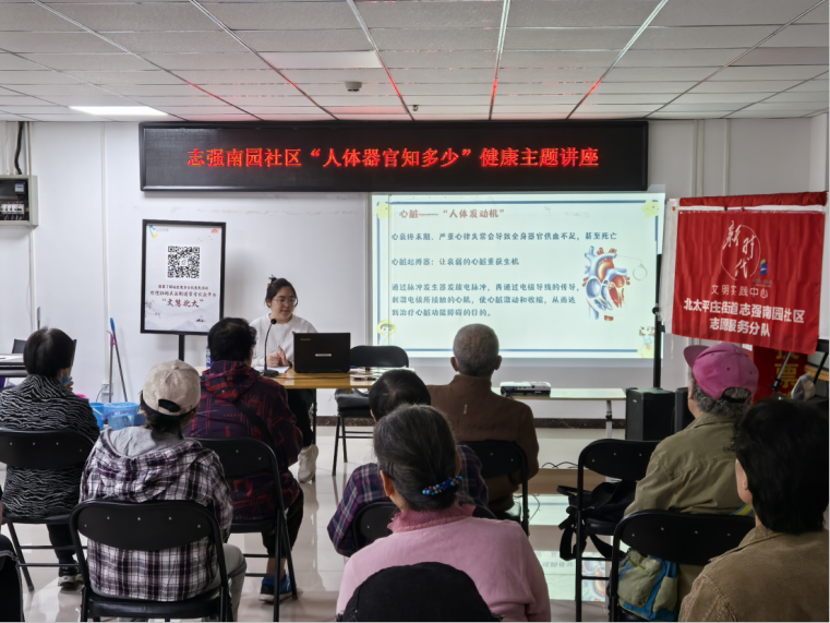 2025年4月17日,崇德党支部王雨彤同志为志强南园社区近20名老年人讲解《人体器官知多少》科普课程。