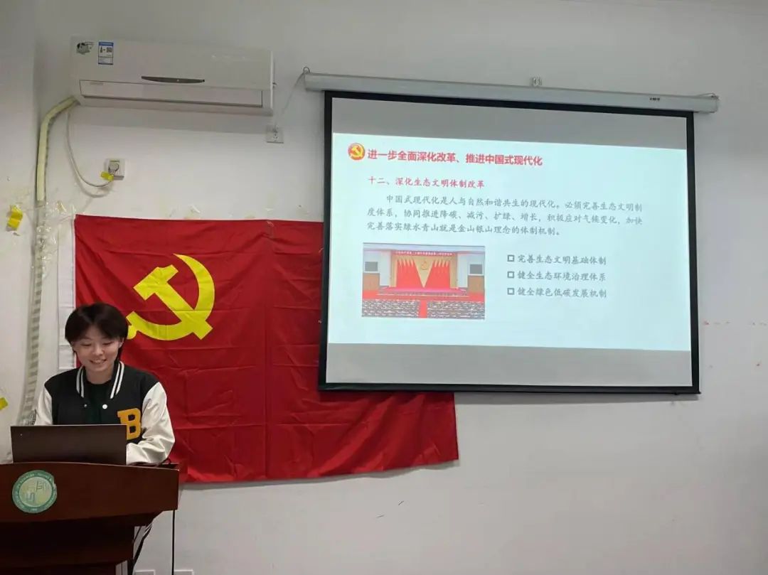 针对第二板块,彭俊瑀同志选取了与支部同学最息息相关的两个部分进行讲解:构建支持全面创新体制机制和深化生态文明体制改革。