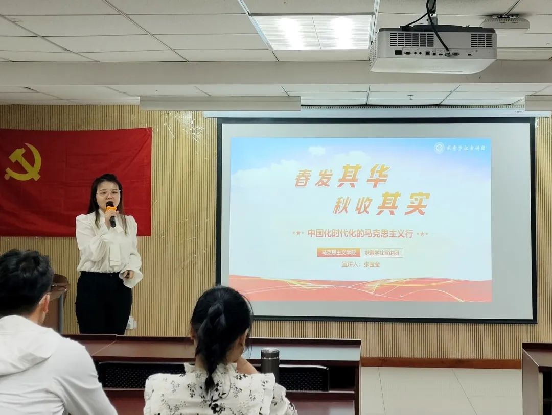张金金同学以《春发其华,秋收其实:中国化时代化的马克思主义行》为题,从理论和实践两个角度围绕“习近平新时代中国特色社会主义思想的世界观与方法论”和“中国共产党的理论创新与社会实践上的应用指导”进行了重点解读,并通过视频的形式展示了习近平总书记在河北正定的足迹和我国经济社会发展取得新的历史性成就。