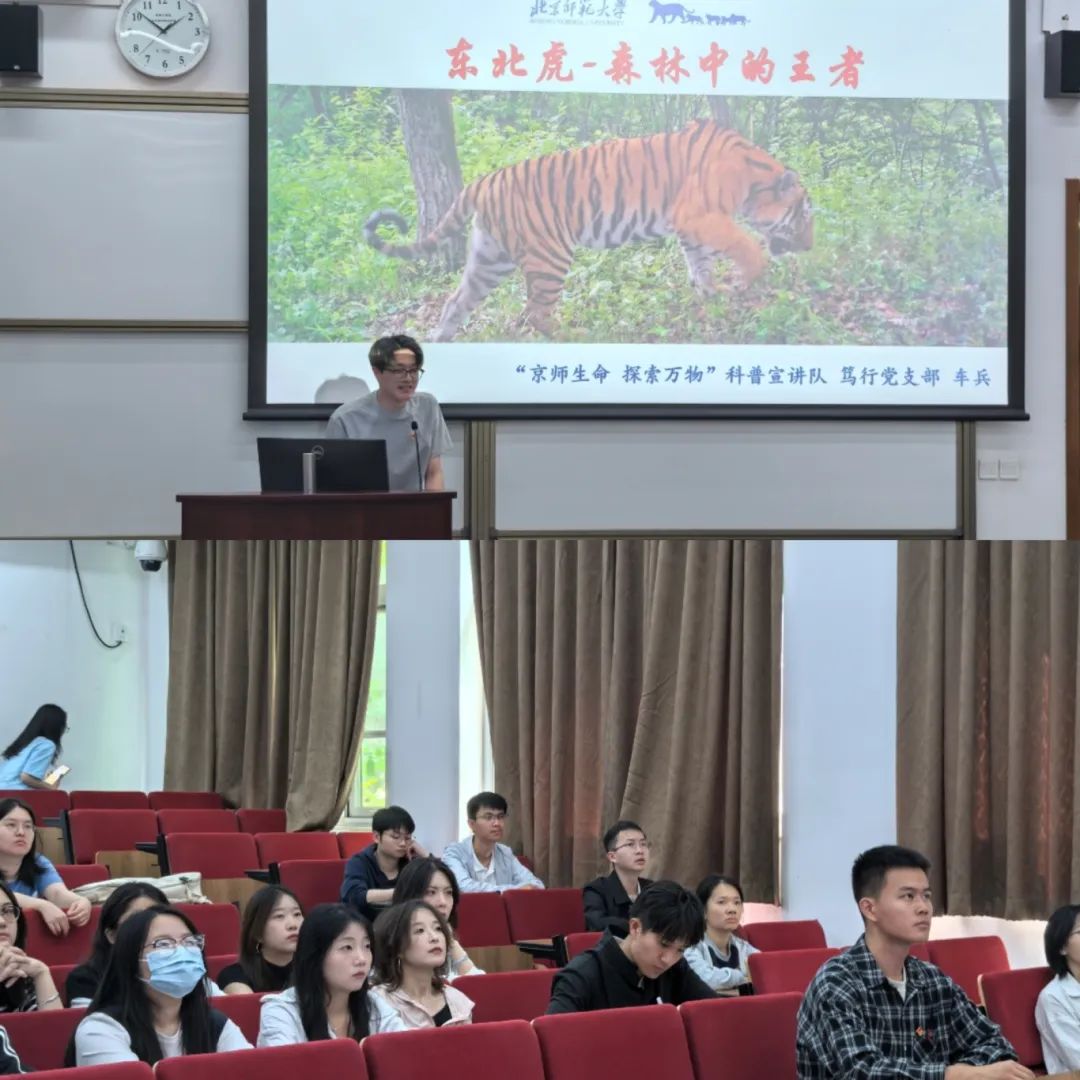 专题学习结束,笃行党支部预备党员车兵同志带来本支部的特色科普课程——《东北虎-森林中的王者》。课程从东北虎形态、分布、生活习性等内容展开,并结合我院虎豹团队曾经获得的监测影像进行展示,生动具体地介绍了野生东北虎的状态,并展示了中国东北虎豹保护工作的卓有成效。两校同学认真听讲,积极参与互动,现场气氛活跃,人与自然和谐共生的生态文明思想根植心中。