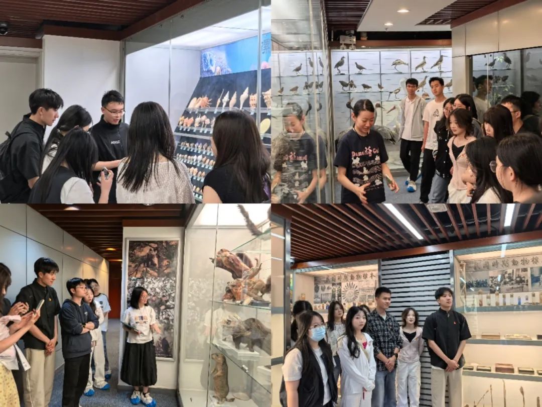 参观结束后,同学们移步至北京师范大学动植物标本馆进行参观。标本馆现藏标本10万余件,其中包括许多著名的珍稀物种、生物演化中的重要代表物种,以及具有文物价值的珍贵标本。三层标本馆,分别由生命科学学院生物学的税君豪、李诗棠和范玉同学带领大家讲解参观,同学们认真听讲,眼前丰富多彩的生物标本,打开认识世界的新大门。从各种微小的无脊椎海洋生物到多姿多彩的爬行、鸟类和哺乳动物等,串联起生命演化与生态保护的壮阔篇章,激发同学们对自然科学的敬畏之心。