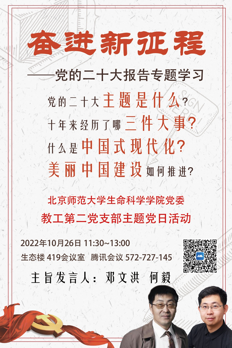 2022年10月27日11:30-13:00,生命科学学院教工第二党支部在生态楼419会议室召开了本学期第二次主题党日活动,活动以“学习二十大 永远跟党走 奋进新征程”为主题,由支部成员邓文洪和何毅两位老师做主旨发言。学院党委副书记殷实老师参加了会议。