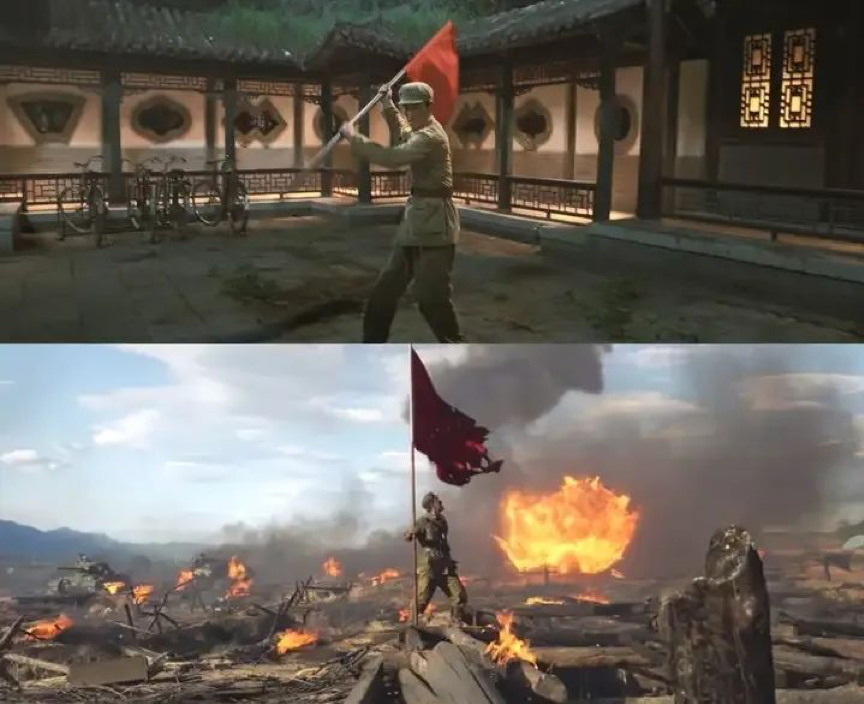 该镜头展示了电影中营教导员李想两次挥舞红旗的场景。