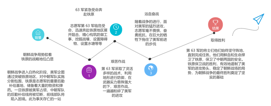 1个小时,敌军的4500吨炮弹向我军一个师的阵地倾泻而至,12昼夜,步坦炮协同的敌军数次冲锋......志愿军战士们发扬“钉子战术”,把自己变成一根钉子,狠狠地钉在阵地上!暗藏机巧的防御工事,神出鬼没的地道突袭,招招见血的贴身肉搏,“人在阵地在”的誓言响彻铁原战场,63军全体将士起,在铁原构成了一道冲不破的“铁长城”。