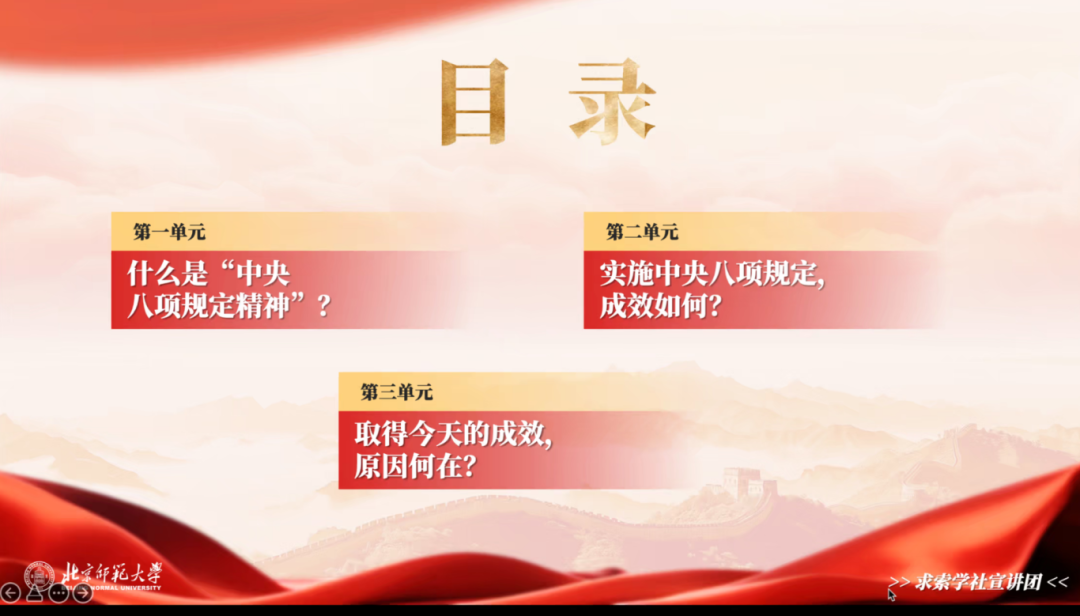 本次活动邀请了北京师范大学求索宣讲团的宣讲员吕沁怡同志,她在讲解中指出,中央八项规定实施十二年来,在作风建设、反腐败斗争等方面取得了显著成效。她强调,重温这一重要制度的历史意义和现实影响,对全体党员深化作风建设、强化纪律意识具有重要教育意义。吕沁怡同志号召大家以身作则,将八项规定精神落实到日常工作中,持续巩固风清气正的政治生态。