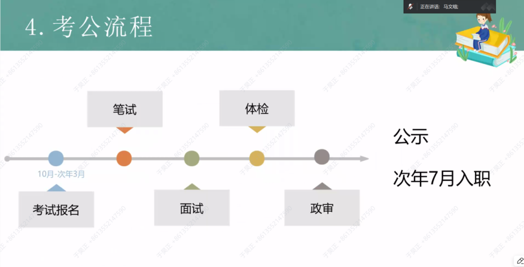最后,师姐为同学们展示了考公的具体流程。从考试报名、笔试、面试、体检到政审的全流程梳理帮助同学们明确备考流程,缓解焦虑,增强信心,并提前规避可能的风险。