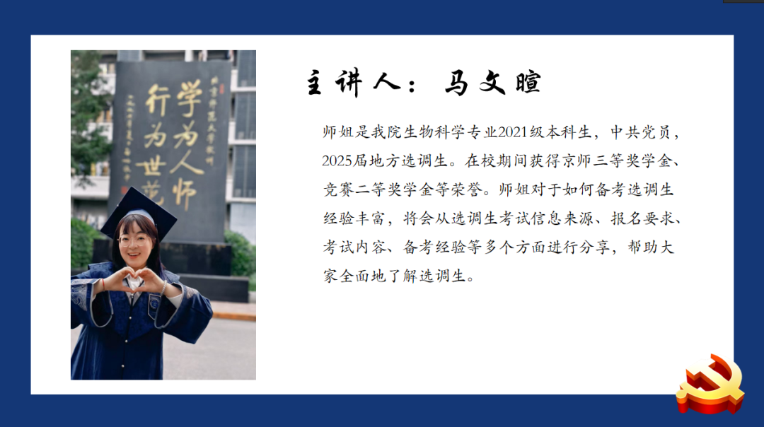 为帮助同学们了解选调生考试的基本情况,更好地选择未来的职业方向,发挥青年力量,2025年8月16日19:00,致远党支部联合生命科学学院研究生会线上举办了“领航计划”——“职业启航,引领人生”主题分享会。本次分享会邀请到了2021级本科生马文暄师姐与大家分享她的选调生以及公务员备考经验,为同学们的考公之路提供宝贵的指导和启示。