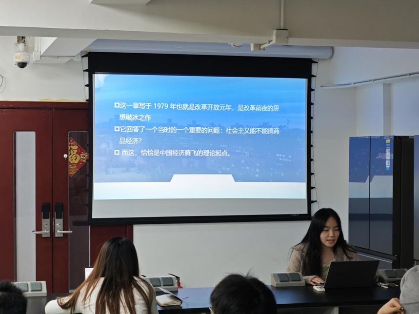 黄诗画同志则对《中国社会主义经济问题研究》第五章“社会主义制度下的商品和货币”进行了专业解读。 她深入探讨了社会主义条件下商品生产的必然性及其特点,系统阐释了价值规律在社会主义经济中的作用机制,为同志们理解社会主义市场经济体制的运行逻辑奠定了坚实的理论基础。