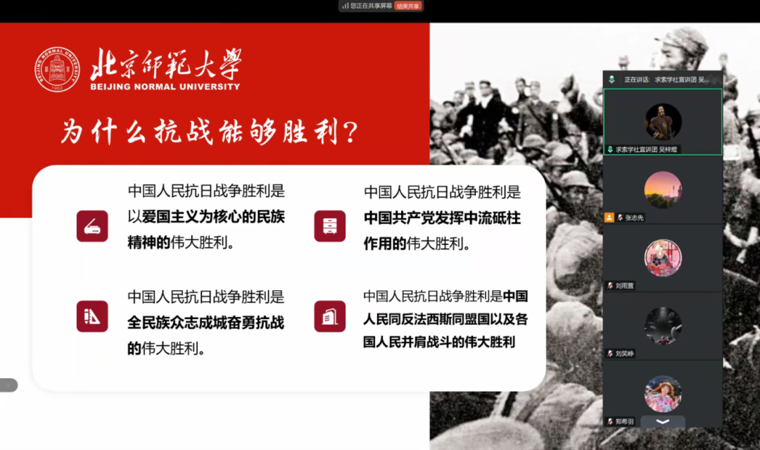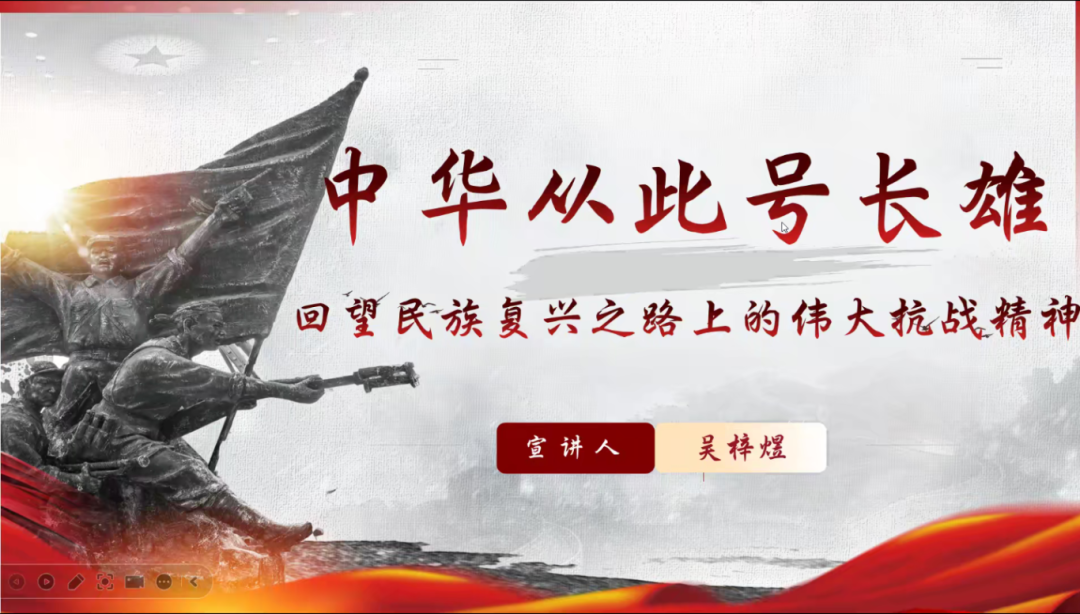 为了让同学们深入了解抗战精神,为实现中华民族伟大复兴贡献青年力量,2025年9月27日19时,致远党支部在线上开展了“中华从此号长雄——回望民族复兴路上的伟大抗战精神分享会”。本期分享会由求索学社宣讲团的吴梓煜同志带领大家回望伟大抗战精神。