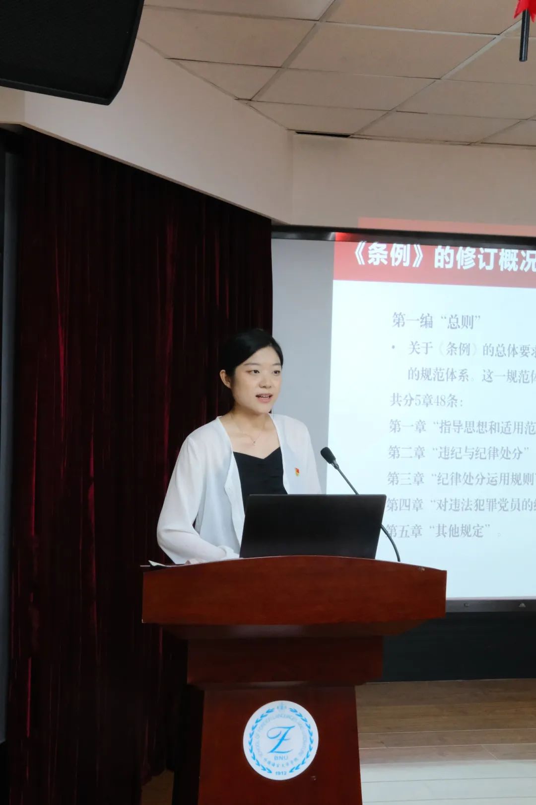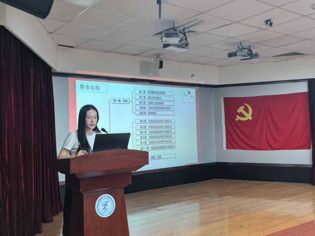 围绕主题“‘学纪知纪明纪守纪’:领会《条例》修订的意义及亮点”,外文学院博学党支部书记郎玮同志介绍了《条例》修订的时代背景及其四大主要意义,外文学院厚德党支部书记张馨予同志介绍了《条例》中总则、分则、附则的修订概况及亮点所在。