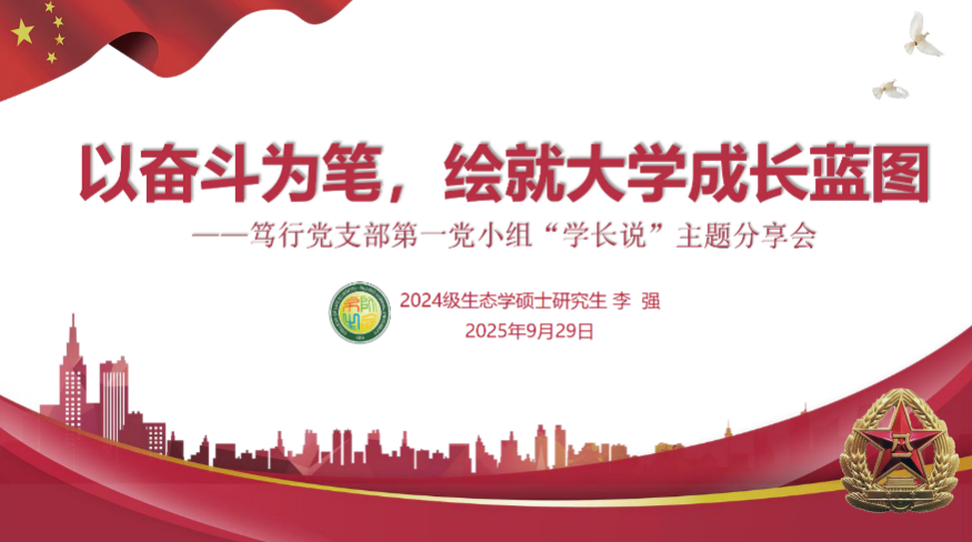 2025年9月29日,笃行党支部书记、2024级生态学硕士研究生李强同志以“以奋斗为笔,绘就大学成长蓝图”为主题,拉开系列活动序幕。