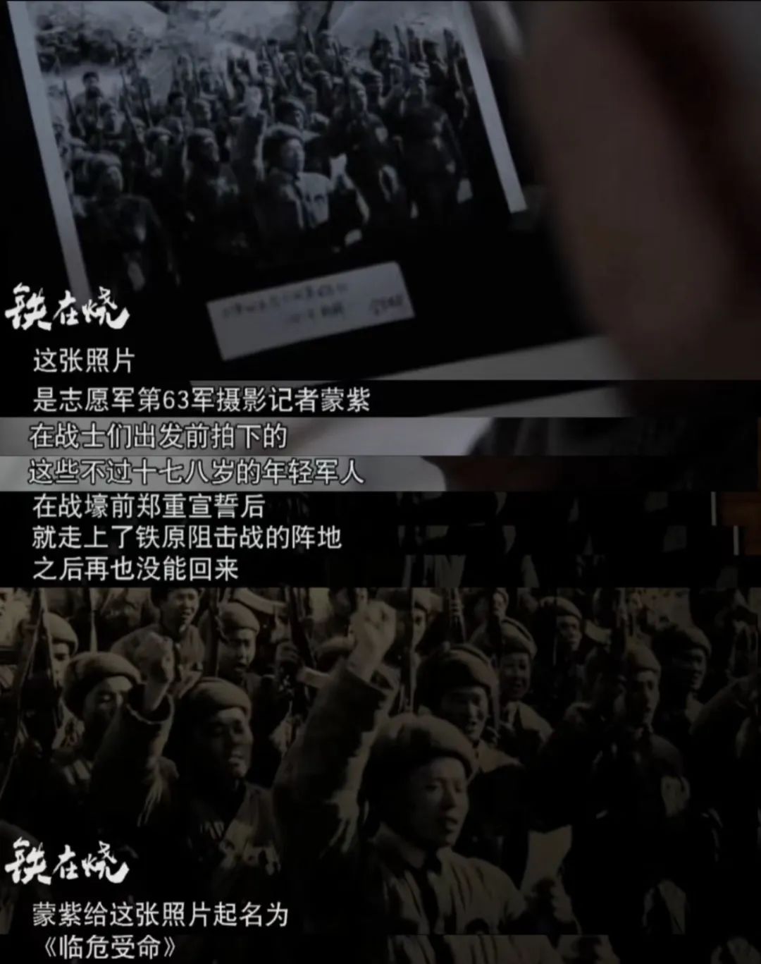 实际上,这张残酷硝烟下的合照其实复刻了63军真实的战场照,照片名字叫做《临危受命》。当时志愿军第63军摄影记者蒙紫给63军的志愿军战士们拍摄了一张集体大合照,年轻的战士们站在战壕前郑重宣誓后便奔赴铁原前线,只留下匆匆前行的背影。一周后,他们在铁原浴血苦战,完成阻击任务,但最终伤亡惨重,大部分战士再未能相见……