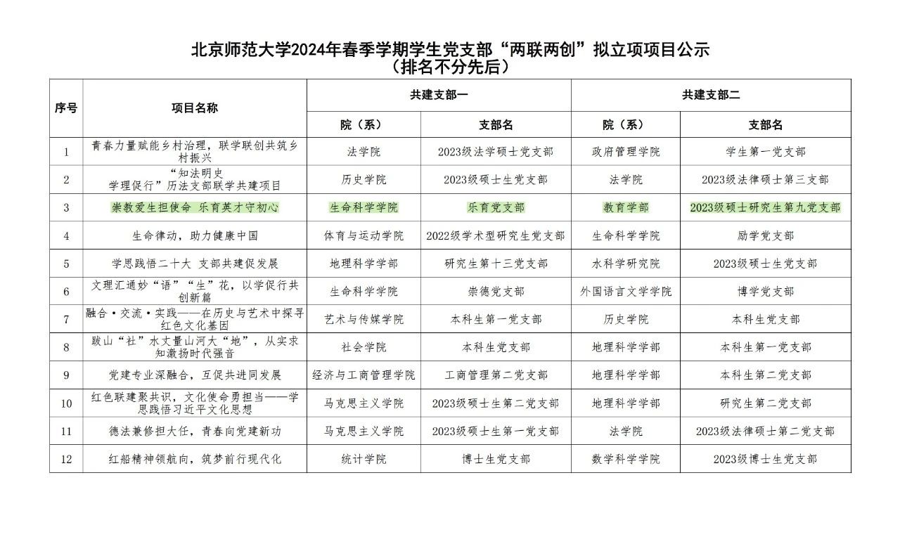 为深入学习贯彻习近平新时代中国特色社会主义思想、党的二十大精神,及学校第十四次党代会精神,落实新时代党的建设总要求,进一步加强学生党支部组织建设,创建培育有特色、有成效的工作品牌,党委学生工作部开展2024年春季学期学生党支部“联学联建、创新创优”项目申报工作。并于近日公布了项目立项名单,生命科学学院乐育党支部与教育学部2023级硕士研究生第九党支部申报的项目“崇教爱生担使命 乐育英才守初心”成功立项。