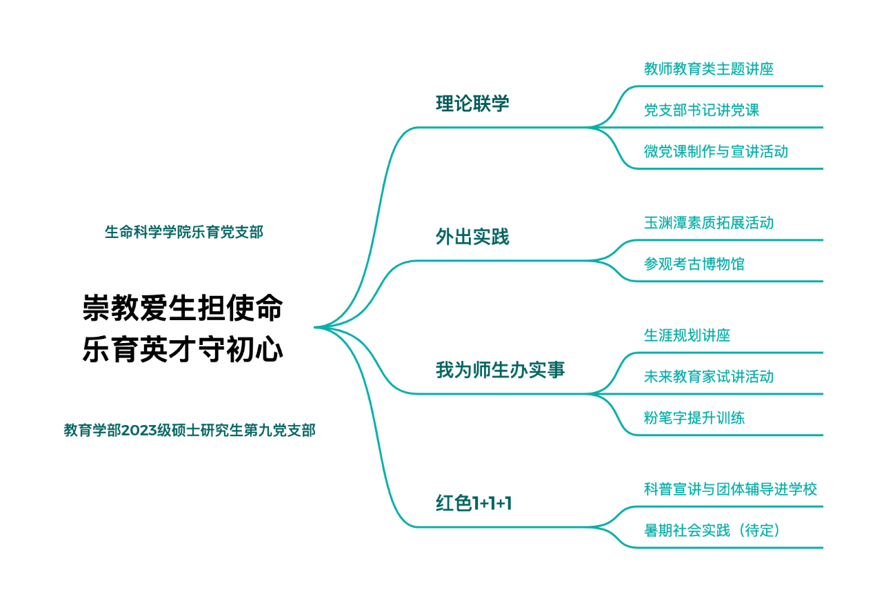 支部以思想政治建设为统领,发挥党建引领学生成长的作用,围绕“学习、实践、服务”三位一体的建设思路,推进党建工作与人才发展深度融合,努力铸造一支“政治过硬、能力卓越、担当有为”的研究生党员队伍。在支部目前举办了两场转正大会、五次主题教育与时政解读的理论学习、五次志愿服务与素质拓展及参观学习等实践活动,后续将进一步提升党支部的服务能力,设置团体辅导专项系列活动。目前与其他支部共同举办活动六次,积累了相应较为丰富的联学联建的基础。支部建立公众号“BNU2023课程心理硕士班”作为宣传阵地,及时进行活动总结与交流,达到进一步巩固理论实践学习的效果。