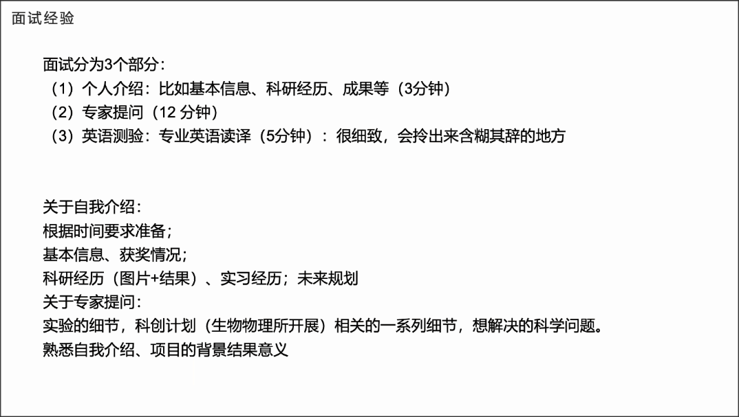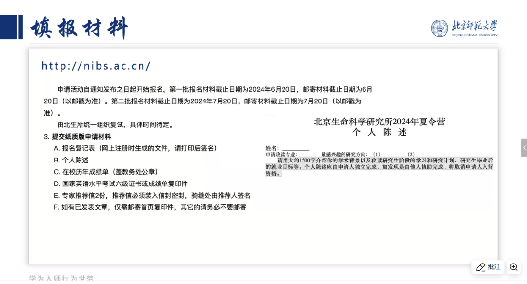 第三位是推免至中国科学院生物物理研究所的董相洋同志。她为我们介绍了研究所的基本情况,并分享了面试流程,包括自我介绍、导师提问和英语翻译等环节,同时讲解了材料准备与提交要求。她鼓励大家合理选择研究方向,积极准备面试,并提醒大家在录取后按时提交政审表和体检报告,密切关注消息。