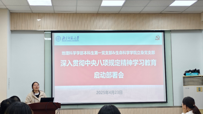 为贯彻落实学校党委深入贯彻中央八项规定精神学习教育的要求,立身党支部联合地理学部本科生第一党支部召开专题学习启动部署会,并邀请求索学社的陈正同志作《党的作风关系人心向背——学习〈习近平关于加强党的作风建设论述摘编〉》主题宣讲,于4月23日晚20点在生地楼 148 会议室召开,支部同志共同深入学习党的作风建设相关内容。