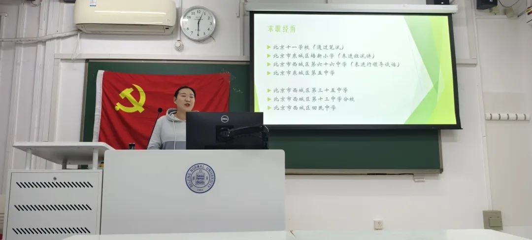 孟庆玉老师首先介绍了自己的求学经历和求职经历,让同学们了解正式成为一名在职教师之前需要进行的笔试、面试、有生或无生试讲、领导谈话、实习等各项工作。随后,她分享了目前已知的求职渠道,为渴望成为中小学教师的同学们提供更多求职平台和方式。