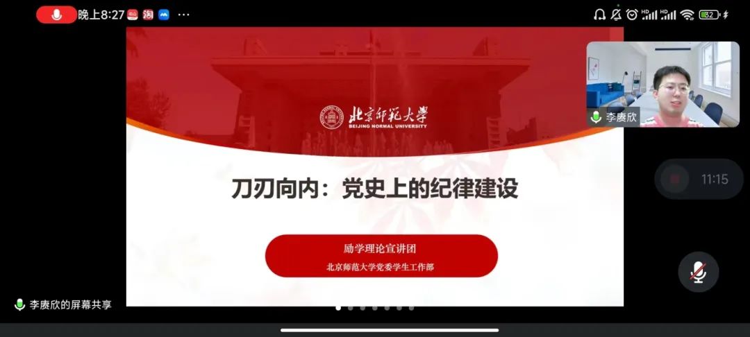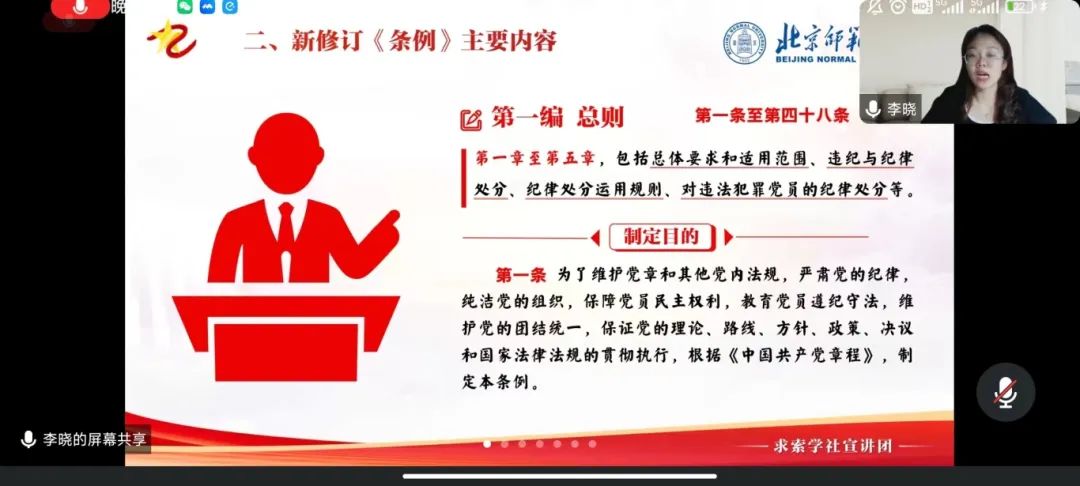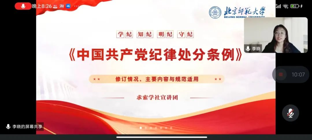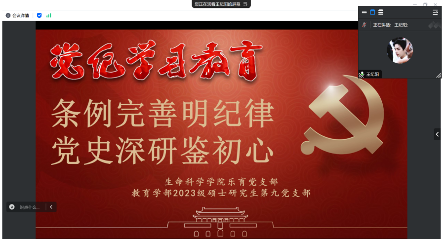 为深入学习贯彻习近平总书记关于党纪学习教育重要讲话和重要指示精神,加强支部党纪建设,树立支部良好党纪风尚,2024年5月21日晚20:00,教育学部2023级硕士研究生第九党支部与生命科学学院乐育党支部,共同邀请了求索学社宣讲团的李晓同志,进行以《〈中国共产党纪律处分条例〉修订情况、主要内容与规范适用》为主题的宣讲活动,并邀请教育学部2023级硕士研究生第九党支部书记李赓欣进行了以《刀刃向内:党史上的纪律建设》为主题的支书讲党课活动。活动由生命科学学院乐育党支部书记王纪阳主持,六十余名同学通过腾讯会议在线参会。
