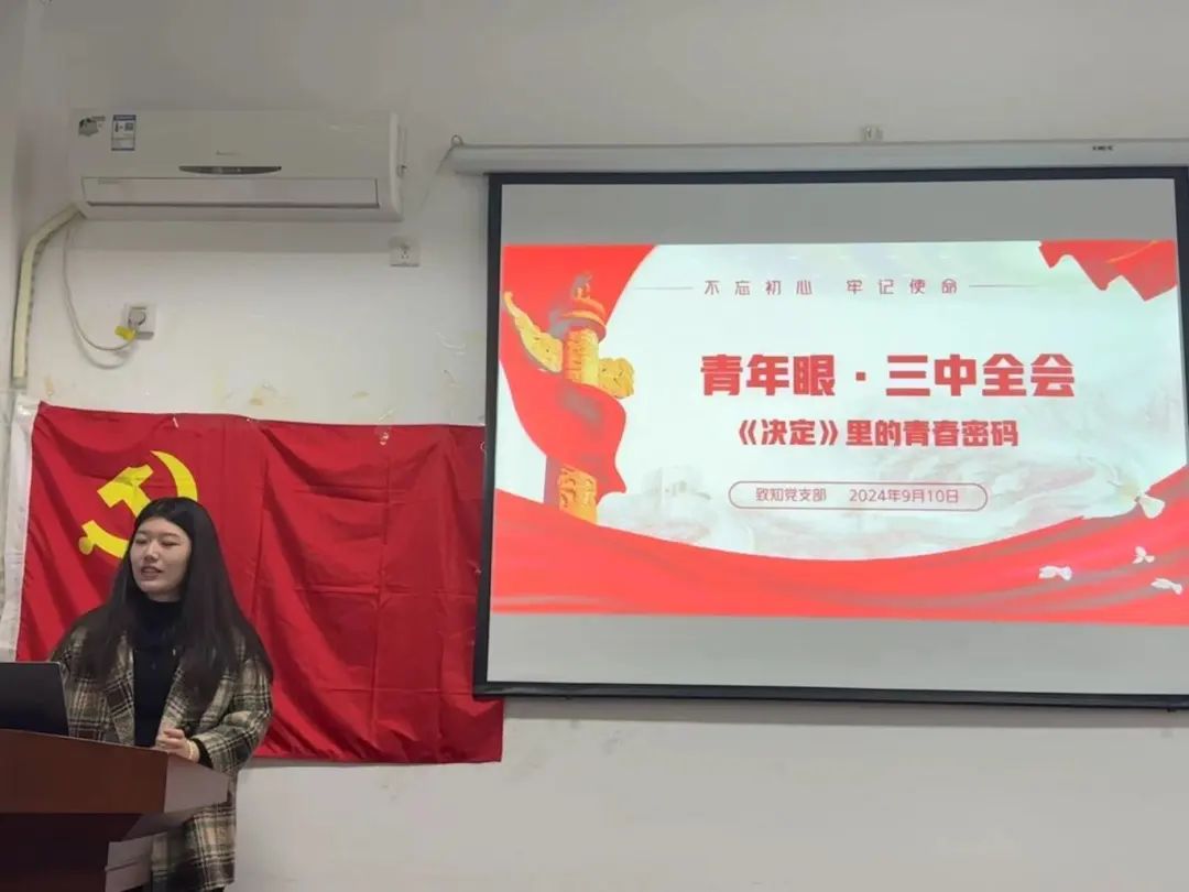 为深化党员理论学习,坚定青年党员理想信念,全面把握党的二十届三中全会的深刻内涵与核心精神,2024年10月9日19:30,致知党支部在生地楼129会议室召开“青年眼·三中全会:《决定》里的青春密码”专题研讨会,会议由支部纪检委员李佳乐主持,7名支部成员参加。
