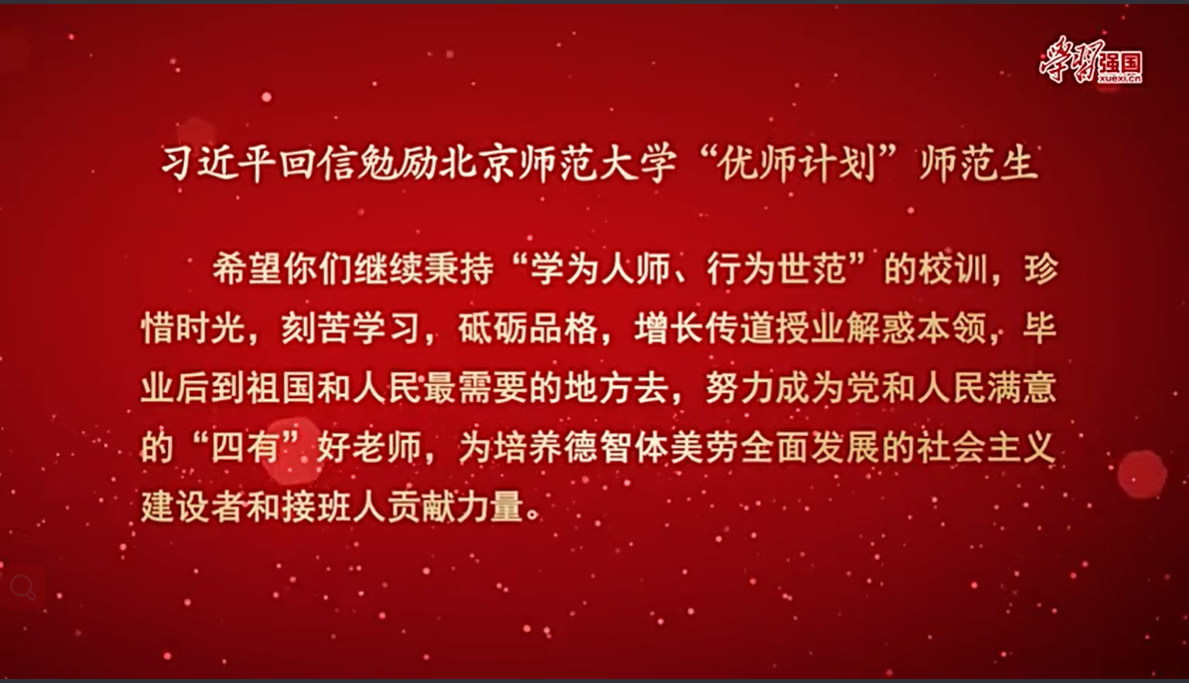 首先,宋宏涛老师带领各位党员老师在学习强国平台一起观看了视频《习近平的教师情》,视频以北京师范大学建校120周年暨第38个教师节来临之际,习近平总书记回信勉励北京师范大学“优师计划”师范生为开始,回放了习近平总书记通过回信、考察、座谈等多种方式对教师和教育工作的关心和指导,使各位教师党员深切体会到职业的自豪感和责任感。