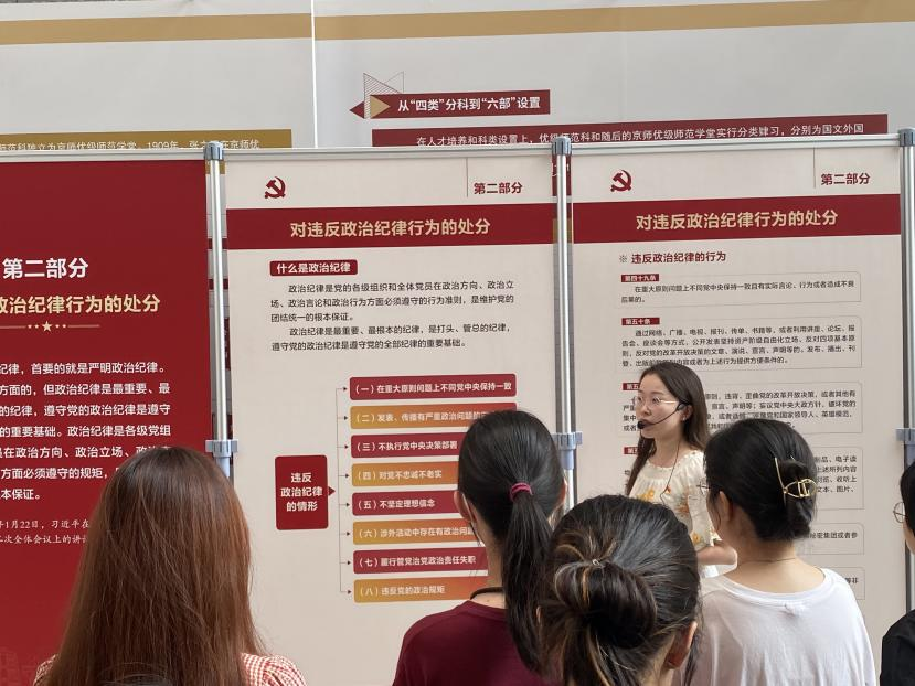 本次展览共分为八个部分,系统介绍了《中国共产党纪律处分条例》总则的修订历程及意义,违反政治纪律、组织纪律、廉洁纪律、群众纪律、工作纪律、生活纪律行为的处分,以及针对违法犯罪党员的纪律处分。