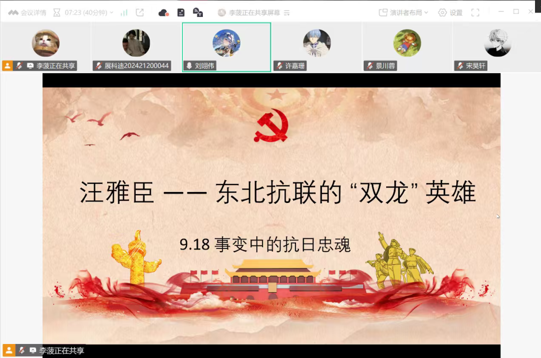 李菠:在肃立默哀的那一刻,我穿越时空,感受到了九一八事变带来的民族创痛。这一分钟的沉默,是对英烈最深的敬意,也是对历史最重的承诺。通过其他四位同志们的分享,一位位英雄从历史中走来:杨靖宇将军在冰天雪地中与敌周旋,牺牲后胃里只有枯草、树皮和棉絮;汪雅臣军长从“双龙”到抗联将领,身先士卒,最终血洒东北;狼牙山五壮士宁死不屈的纵身一跃;刘老庄连八十二勇士全部壮烈殉国,用生命掩护群众转移。这些故事让我深刻体会到,正是无数英烈用鲜血铸就了今日的中国。这次党会让我明白,铭记历史不是要延续仇恨,而是要汲取奋进的力量。作为新时代的党员,我们要把爱国之情转化为报国之行,用知识和本领武装自己,让我们的国家更加富强,让历史的悲剧不再重演。