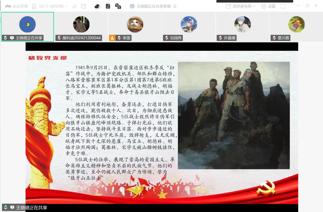 活动在肃立默哀中拉开帷幕,全体同志神情庄重,静默追思,向在九一八事变中英勇牺牲的革命先烈表达深切缅怀与崇高敬意。随后,大家在分享人的带领下重温九一八事变的历史脉络,借助珍贵的历史图片与文献资料,学习了汪雅臣、狼牙山五壮士、刘老庄连、杨靖宇等抗日英雄的感人事迹,一段段荡气回肠的故事,一幕幕宁死不屈的画面,让与会同志深受触动。大家一致认为,英雄们用生命诠释的爱国主义精神和革命气节,是激励我们砥砺前行的宝贵精神财富。
