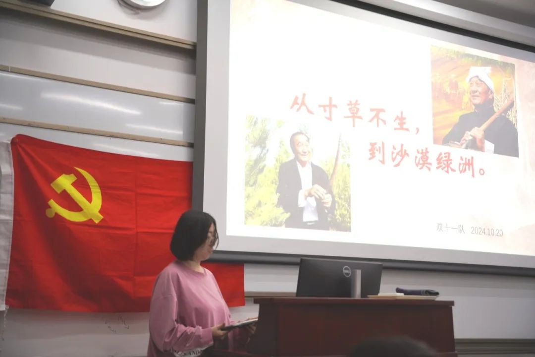 双十一队来自励学党支部,团队成员有赵芹、曹佳鑫、胡佳瑞、王子欣。团队所展示题目为《从寸草不生到沙漠绿洲》。团队介绍了石光银历经重重困难成功治理沙地的故事,讲述一代代治沙人敢于担当,艰苦奋斗,踏实肯学,可持续发展,薪火相传的“治沙人”精神,激励着后人投身治沙事业。