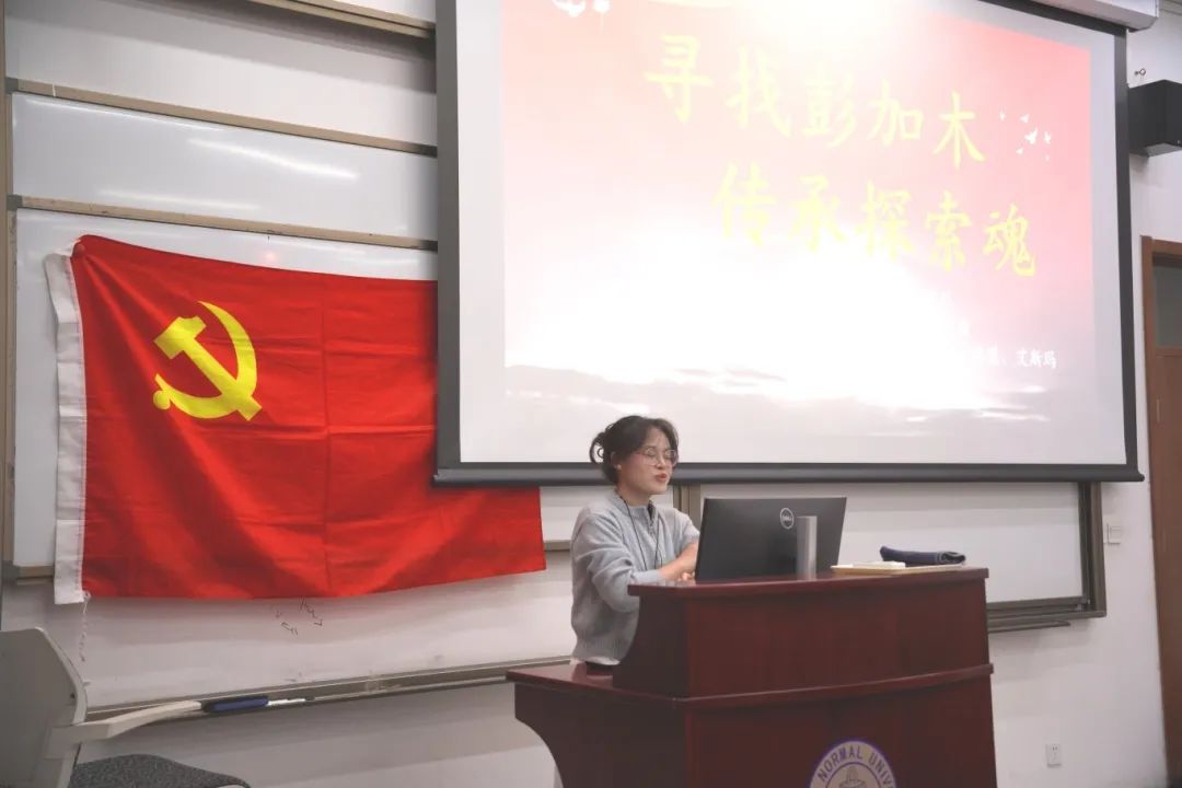 寻找队来自励学党支部,团队成员有林慧、李盈敏、艾斯玛、陈紫钰。团队所展示题目为《寻找彭加木,传承探索魂》。该团队讲述了彭加木的科学考察事迹,感慨其为国家科研事业做出的卓越贡献。彭加木的研究成果及探究精神也激励着后人追寻他的足迹,推动跨学科研究。