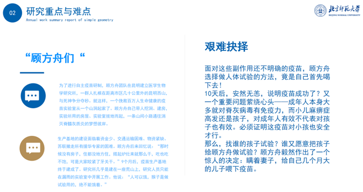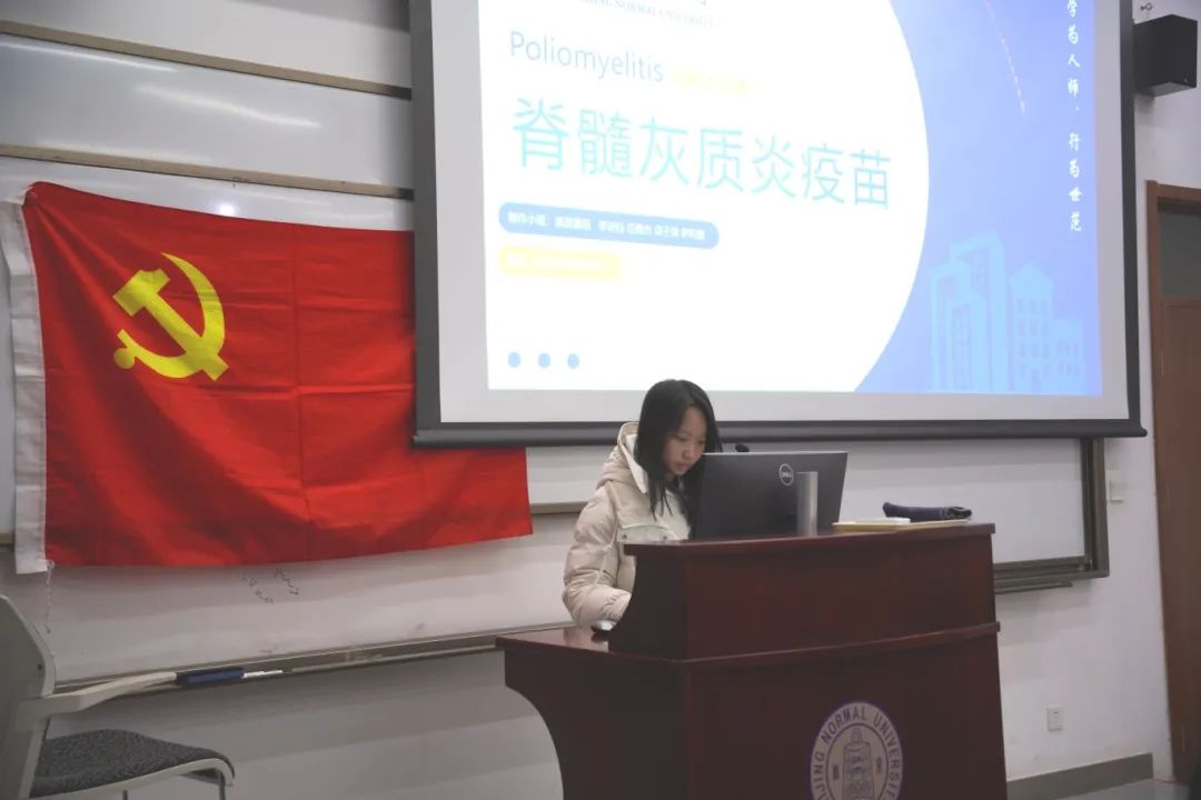 基因重组队来自格致党支部,团队成员有任煜杰、李诗钰、邱子淇、伊利嘉。团队所展示题目为《脊髓灰质炎疫苗》。团队详细介绍了脊髓灰质炎疫苗的研发过程,赞扬顾方舟团队逐个击破研究重难点的无私奉献,迎难而上的精神,以及脊髓灰质炎的消灭对我国医疗卫生、经济发展的重要意义。