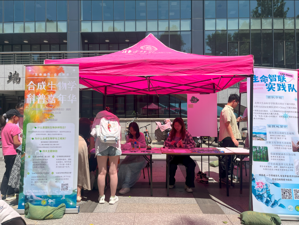 2025年5月24日,北京师范大学生命科学学院励学党支部联合BNU-China iGEM竞赛队、人工智能学院本科第二党支部,在邱季端体育馆南侧举办合成生物学科普嘉年华暨“生命智联”外场活动。本届嘉年华活动以“生命编码,合成新章”为主题,旨在于五月的国际生物多样性日宣传推广合成生物学以及生物多样性的知识,增进全校师生对合成生物学的认知,同时助力“生命智联”实践队推广实践活动,开展宣传工作。