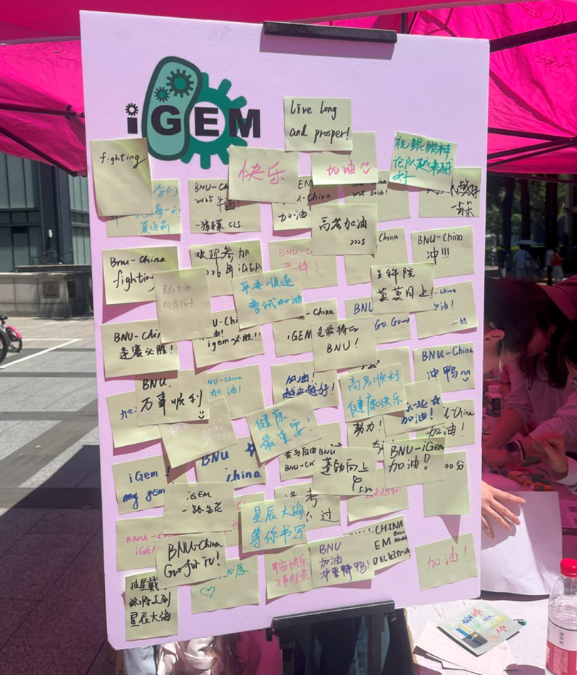在“合成生物留言板”活动中,同学们在留言板上写下自己的奇思妙想,有对合成生物学的疑问,也有对合成生物学的期望,还有对合成生物学的兴趣点,更有对2025 iGEM BNU-China竞赛队的祝福。更多热爱生命科学的朋友们通过留言板分享,碰撞出合成生物学思维火花。