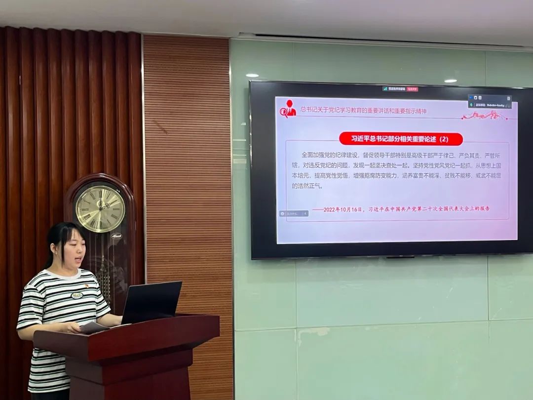 支部书记王纪阳同志从总书记关于党纪学习教育的重要论述、《条例》的总体要求和适用范围以及在思想道德与道德修养上需要严守的底线几个方面,开展党纪学习教育,进一步对近期各种活动中的党纪学习内容进行总结和回顾。